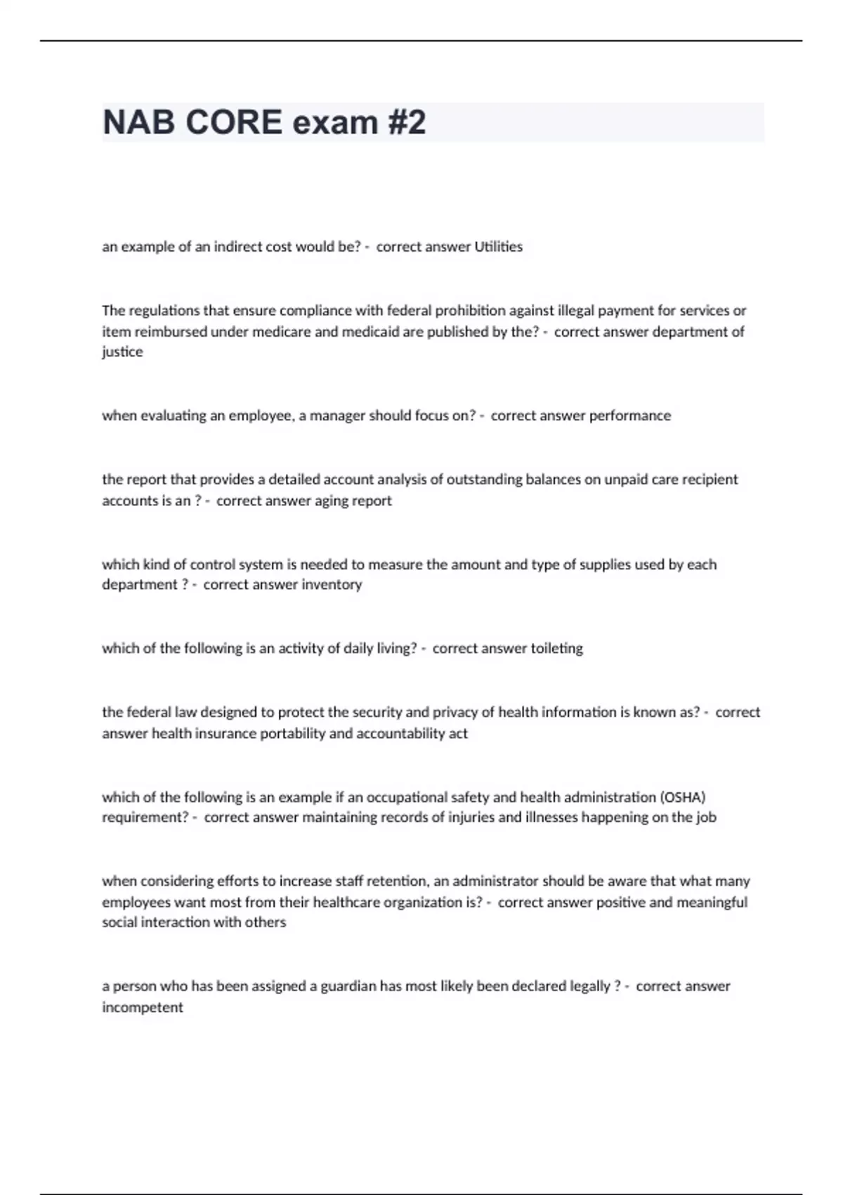 an example of an indirect cost would be? - correct answer Utilities The regulations that ensure compliance with federal prohibition against illegal payment for services or item reimbursed under medicare and medicaid are published by the? - correct answer department of justice when evaluating an employee, a manager should focus on? - correct answer performance the report that provides a detailed account analysis of outstanding balances on unpaid care recipient accounts is an ? - correct answer aging report which kind of control system is needed to measure the amount and type of supplies used by each department ? - correct answer inventory which of the following is an activity of daily living? - correct answer toileting the federal law designed to protect the security and privacy of health information is known as? - correct answer health insurance portability and accountability act which of the following is an example if an occupational safety and health administration (OSHA) requirement? - correct answer maintaining records of injuries and illnesses happening on the job when considering efforts to increase staff retention, an administrator should be aware that what many employees want most from their healthcare organization is? - correct answer positive and meaningful social interaction with others a person who has been assigned a guardian has most likely been declared legally ? - correct answer incompetent