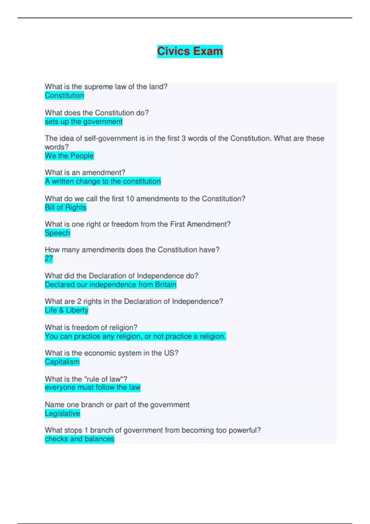 2024 Civics Exam - Questions and Answers What is the supreme law of the land? Constitution What does the Constitution do? sets up the government The idea of self-government is in the first 3 words of the Constitution. What are these words? We the People What is an amendment? A written change to the constitution What do we call the first 10 amendments to the Constitution? Bill of Rights What is one right or freedom from the First Amendment? Speech How many amendments does the Constitution have? 27 What did the Declaration of Independence do? Declared our independence from Britain What are 2 rights in the Declaration of Independence? Life & Liberty What is freedom of religion? You can practice any religion, or not practice a religion. What is the economic system in the US? Capitalism What is the "rule of law"? everyone must follow the law Name one branch or part of the government Legislative What stops 1 branch of government from becoming too powerful? checks and balances Who is in charge of the executive branch? President Who makes federal laws? Congress What are 2 parts of the US Congress? Senate and House of Representatives How many US senators are there? 100 We elect a US Senator for how many years? 6 Who is one of your State's senators? Katie Britt and Tommy Tubberville The House of Representatives has how many members? 435 We elect a U.S. Representative for how many years? 2 years Name your U.S. Representative. Jerry Carl Who does a senator represent? all the people of the state Why do some states have more Representatives than other states? States Population