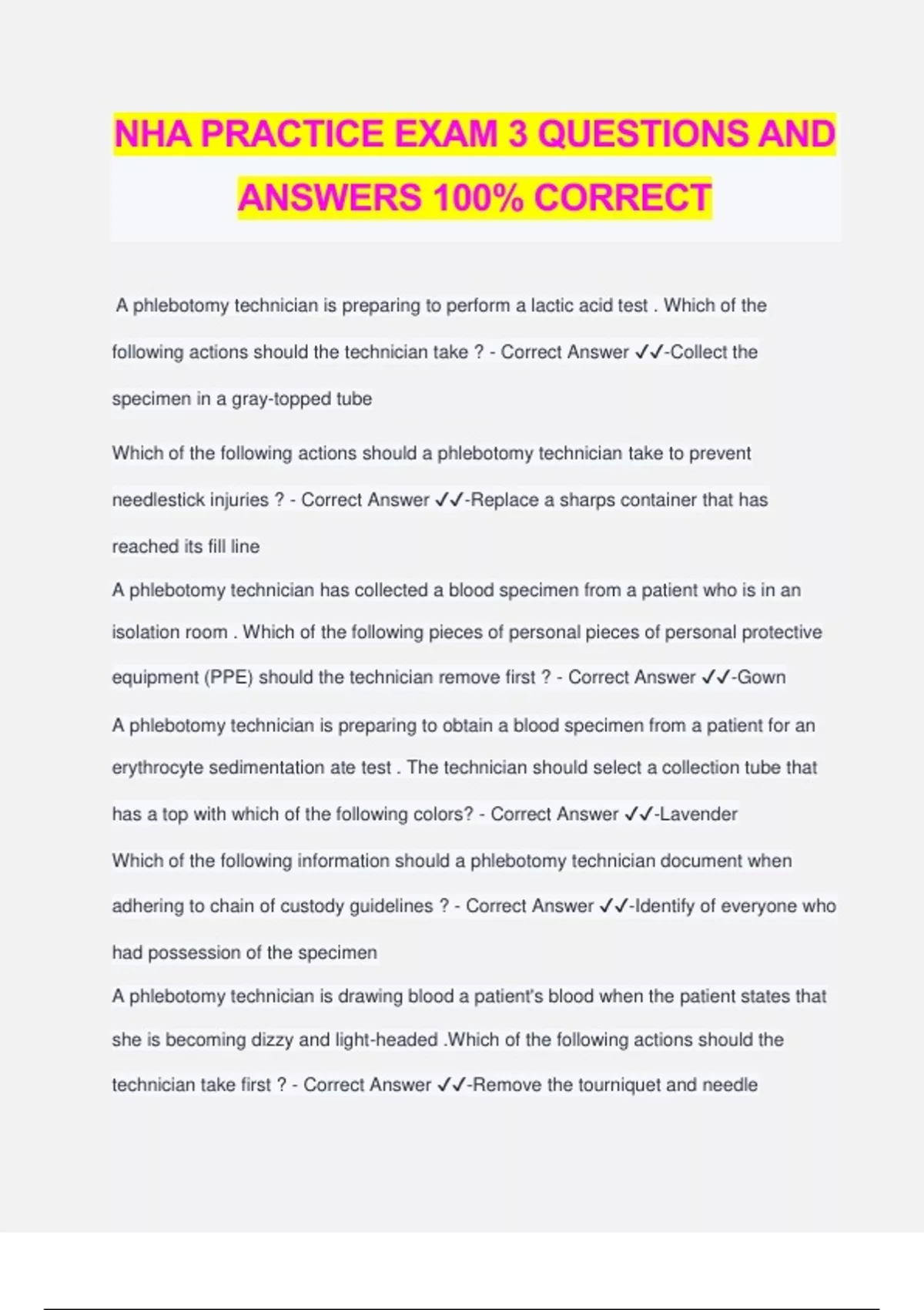 NHA PRACTICE EXAM 3 QUESTIONS AND ANSWERS 100% CORRECT A phlebotomy technician is preparing to perform a lactic acid test . Which of the following actions should the technician take ? - Correct Answer ️️ -Collect the specimen in a gray-topped tube Which of the following actions should a phlebotomy technician take to prevent needlestick injuries ? - Correct Answer ️️ -Replace a sharps container that has reached its fill line A phlebotomy technician has collected a blood specimen from a patient who is in an isolation room . Which of the following pieces of personal pieces of personal protective equipment (PPE) should the technician remove first ? - Correct Answer ️️ -Gown A phlebotomy technician is preparing to obtain a blood specimen from a patient for an erythrocyte sedimentation ate test . The technician should select a collection tube that has a top with which of the following colors? - Correct Answer ️️ -Lavender Which of the following information should a phlebotomy technician document when adhering to chain of custody guidelines ? - Correct Answer ️️ -Identify of everyone who had possession of the specimen A phlebotomy technician is drawing blood a patient's blood when the patient states that she is becoming dizzy and light-headed .Which of the following actions should the technician take first ? - Correct Answer ️️ -Remove the tourniquet and needle A phlebotomy technician is an outpatient facility finds a patient who is in shock and bleeding profusely from his leg.Which of the following actions should the technician take first ? - Correct Answer ️️ -Apply direct pressure to the wound A phlebotomy technician is obtaining a blood culture specimen from an adult patient .Which of the following actions should the technician take ? - Correct Answer ️️ - Withdraw the blood into a sterile safety syringe A phlebotomy technician should identify that HIPPA protects which of the following rights as part of the patient care partnership? - Correct Answer ️️ -Privacy A phlebotomy technician enters a patient's room to perform a venipuncture and finds the patient sleeping.Which of the following actions should the technician take? - Correct Answer ️️ -Gently wake the patient Which of the following actions should a phlebotomy technician take when reporting laboratory results ? - Correct Answer ️️ -Send the results to the patient's ordering provider A phlebotomy technician is preparing to draw blood specimen from a patient who is alone unresponsive.The technician should collect the specimen using which of the following forms of consent ? - Correct Answer ️️ -Implied consent Which of the following actions should a phlebotomy technician take to maintain compliance with HIPPA? - Correct Answer ️️ -Clear phone number from the fax machine Blood cultures have been ordered on an adult patient in an intensive care unit.A nurse calls a phlebotomy technician to bring the appropriate materials .Which of the following materials should the phlebotomy technician bring ? - Correct Answer ️️ -An aerobic bottle and an anaerobic bottle After placing a tourniquet on a patient's arm , phlebotomy technician notices small red spots below the tourniquet.Which of the following terms describes these spots ? - Correct Answer ️️ -Petechiae A patient who has diabetes states that he prefers to be drawn on the inside of his wrist. Which of the following actions should a phlebotomy technician take ? - Correct Answer ️️ -Attempt to draw from the antecubital region A phlebotomy technician is preparing to draw blood from a patient who states that she fainted during her last blood draw. Which of the following actions should the technician take? - Correct Answer ️️ -Ask the patient to lie down for the procedure A phlebotomy technician is instructing a patient about to collect a 24-hr urine specimen. Which of the following instructions should the technician include ? - Correct Answer ️️ -Discard the first void of the morning