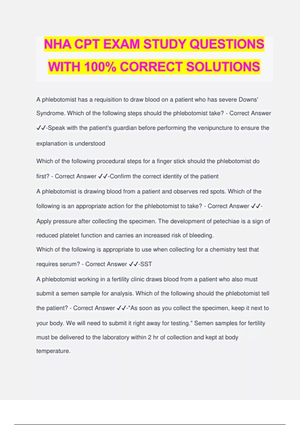 NHA CPT EXAM STUDY QUESTIONS WITH 100% CORRECT SOLUTIONS A phlebotomist has a requisition to draw blood on a patient who has severe Downs' Syndrome. Which of the following steps should the phlebotomist take? - Correct Answer ️️ -Speak with the patient's guardian before performing the venipuncture to ensure the explanation is understood Which of the following procedural steps for a finger stick should the phlebotomist do first? - Correct Answer ️️ -Confirm the correct identity of the patient A phlebotomist is drawing blood from a patient and observes red spots. Which of the following is an appropriate action for the phlebotomist to take? - Correct Answer ️️ - Apply pressure after collecting the specimen. The development of petechiae is a sign of reduced platelet function and carries an increased risk of bleeding. Which of the following is appropriate to use when collecting for a chemistry test that requires serum? - Correct Answer ️️ -SST A phlebotomist working in a fertility clinic draws blood from a patient who also must submit a semen sample for analysis. Which of the following should the phlebotomist tell the patient? - Correct Answer ️️ -"As soon as you collect the specimen, keep it next to your body. We will need to submit it right away for testing." Semen samples for fertility must be delivered to the laboratory within 2 hr of collection and kept at body temperature. Which of the following test results are affected when povidone iodine is used to cleanse the site for a dermal puncture? - Correct Answer ️️ -Potassium Blood cultures have been ordered on a patient in the intensive care unit. The nurse calls the phlebotomist to bring the appropriate materials. Which of the following should the phlebotomist bring? - Correct Answer ️️ -An aerobic and an anaerobic bottle When a phlebotomist is distributing laboratory results to ordering physicians, which results have priority? - Correct Answer ️️ -Pre-surgical test results are a priority to report, because the results may alter how or if a surgery is performed. Which of the following can cause a hemolyzed specimen? - Correct Answer ️️ - Shaking the collection tube vigorously. This will cause the red blood cells to rupture, causing hemolysis. Which of the following is an example of the acceptable reporting of routine lab results? - Correct Answer ️️ -Send the results to the physician in a marked envelope. Before the phlebotomist performs a venipuncture, the patient warns the he is HIV positive. According to OSHA regulations, after donning gloves, the phlebotomist should... - Correct Answer ️️ -perform the venipuncture as normal per OSHA regulations. Which of the following is an appropriate cleanser for cleansing around the urinary meatus in a clean-catch urine collection - Correct Answer ️️ -Benzalkonium chloride The phlebotomist should use a tube with which of the following anticoagulants to collect a PT/PTT test? - Correct Answer ️️ -Sodium citrate