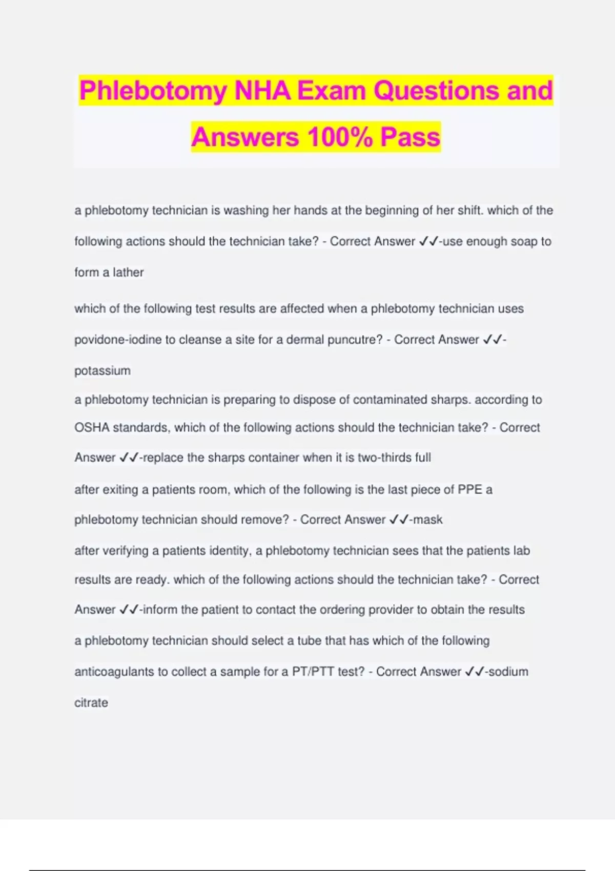 Phlebotomy NHA Exam Questions and Answers 100% Pass a phlebotomy technician is washing her hands at the beginning of her shift. which of the following actions should the technician take? - Correct Answer ️️ -use enough soap to form a lather which of the following test results are affected when a phlebotomy technician uses povidone-iodine to cleanse a site for a dermal puncutre? - Correct Answer ️️ - potassium a phlebotomy technician is preparing to dispose of contaminated sharps. according to OSHA standards, which of the following actions should the technician take? - Correct Answer ️️ -replace the sharps container when it is two-thirds full after exiting a patients room, which of the following is the last piece of PPE a phlebotomy technician should remove? - Correct Answer ️️ -mask after verifying a patients identity, a phlebotomy technician sees that the patients lab results are ready. which of the following actions should the technician take? - Correct Answer ️️ -inform the patient to contact the ordering provider to obtain the results a phlebotomy technician should select a tube that has which of the following anticoagulants to collect a sample for a PT/PTT test? - Correct Answer ️️ -sodium citrate when should a phlebotomy technician perform external liquid controls for a quality control on CLIA-waived glucose POC test? - Correct Answer ️️ -when a new lot number or kit is opened which of the following tubes should a phlebotomy technician collect first when obtaining dermal samples? - Correct Answer ️️ -lavender top a phlebotomy technician is preparing several specimens for transport to the facilitys lab. which of the following specimens should the technician protect from bright light by placing it in an amber/brown biohazard bag for transport? - Correct Answer ️️ -vitamin B6 a phlebotomy technician is obtaining a blood culture specimen from an adult patient. which of the following actions should the technician take? - Correct Answer ️️ - withdraw the blood into a sterile safety syringe a phlebotomy technician is collecting blood from a patient for donation. the collection bag only fills halfway, and the vein collapses. which of the following actions should the technician take? - Correct Answer ️️ -use a new collection bag to draw a new unit of blood
