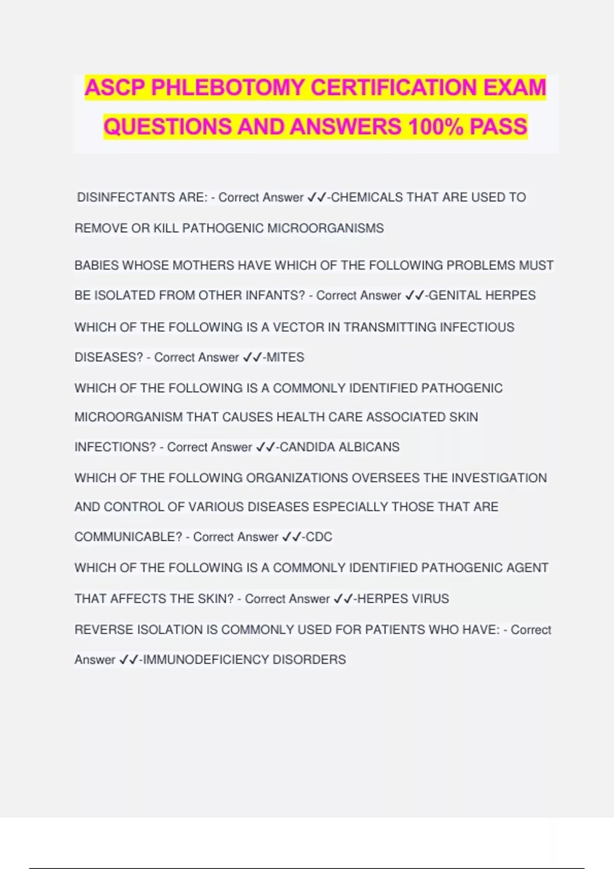 ASCP PHLEBOTOMY CERTIFICATION EXAM QUESTIONS AND ANSWERS 100% PASS DISINFECTANTS ARE: - Correct Answer ️️ -CHEMICALS THAT ARE USED TO REMOVE OR KILL PATHOGENIC MICROORGANISMS BABIES WHOSE MOTHERS HAVE WHICH OF THE FOLLOWING PROBLEMS MUST BE ISOLATED FROM OTHER INFANTS? - Correct Answer ️️ -GENITAL HERPES WHICH OF THE FOLLOWING IS A VECTOR IN TRANSMITTING INFECTIOUS DISEASES? - Correct Answer ️️ -MITES WHICH OF THE FOLLOWING IS A COMMONLY IDENTIFIED PATHOGENIC MICROORGANISM THAT CAUSES HEALTH CARE ASSOCIATED SKIN INFECTIONS? - Correct Answer ️️ -CANDIDA ALBICANS WHICH OF THE FOLLOWING ORGANIZATIONS OVERSEES THE INVESTIGATION AND CONTROL OF VARIOUS DISEASES ESPECIALLY THOSE THAT ARE COMMUNICABLE? - Correct Answer ️️ -CDC WHICH OF THE FOLLOWING IS A COMMONLY IDENTIFIED PATHOGENIC AGENT THAT AFFECTS THE SKIN? - Correct Answer ️️ -HERPES VIRUS REVERSE ISOLATION IS COMMONLY USED FOR PATIENTS WHO HAVE: - Correct Answer ️️ -IMMUNODEFICIENCY DISORDERS WHICH OF THE FOLLOWING IS A COMMONLY IDENTIFIED CAUSATIVE AGENT OF NOSOCOMIAL INFECTIONS IN THE NURSERY UNIT? - Correct Answer ️️ - ESCHERICHIA COLI WHICH OF THE FOLLOWING CHEMICAL COMPOUNDS IS AN ANTISEPTIC FOR SKIN? - Correct Answer ️️ -HEXYLRESORCINOL A PHLEBOTOMIST HAD TO AVOID CONTACT WITH PATIENTS FOR 24 HOURS AFTER BEING STARTED ON AN APPROPRIATE ANTIBIOTIC AND APPEARING SYMPTOM FREE. WHAT TYPE OF INFECTION COULD HE OR SHE HAVE ACQUIRED FOR THE ABOVE WORK LIMITATIONS TO APPLY? - Correct Answer ️️ -STREP THROAT (GROUP A) THE HICPAC TRANSMISSION BASED PRECAUTIONS INCLUDE: - Correct Answer ️️ -AIRBORNE, DROPLET, AND CONTACT ABOUT HOW MANY PATIENTS ACQUIRE A NOSOCOMIAL INFECTION ANNUALLY? - Correct Answer ️️ -1.75 TO 3 MILLION