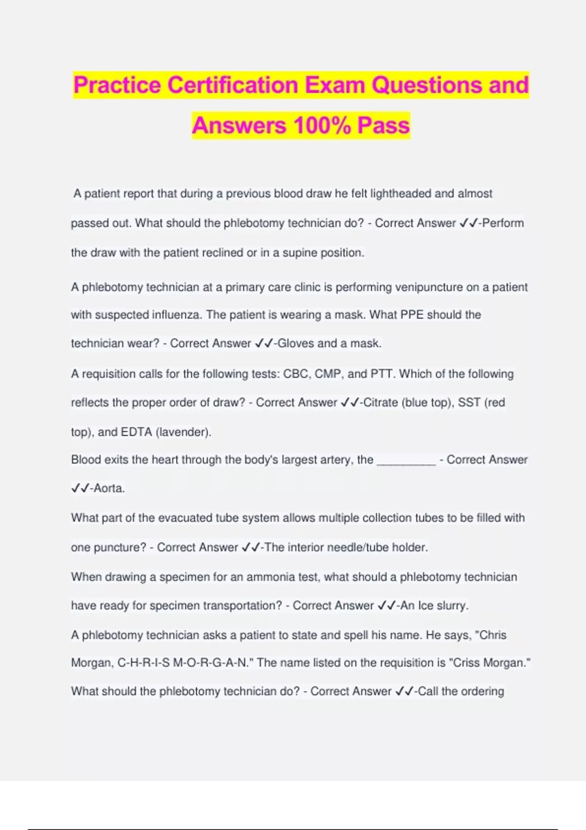 Practice Certification Exam Questions and Answers 100% Pass A patient report that during a previous blood draw he felt lightheaded and almost passed out. What should the phlebotomy technician do? - Correct Answer ️️ -Perform the draw with the patient reclined or in a supine position. A phlebotomy technician at a primary care clinic is performing venipuncture on a patient with suspected influenza. The patient is wearing a mask. What PPE should the technician wear? - Correct Answer ️️ -Gloves and a mask. A requisition calls for the following tests: CBC, CMP, and PTT. Which of the following reflects the proper order of draw? - Correct Answer ️️ -Citrate (blue top), SST (red top), and EDTA (lavender). Blood exits the heart through the body's largest artery, the _________ - Correct Answer ️️ -Aorta. What part of the evacuated tube system allows multiple collection tubes to be filled with one puncture? - Correct Answer ️️ -The interior needle/tube holder. When drawing a specimen for an ammonia test, what should a phlebotomy technician have ready for specimen transportation? - Correct Answer ️️ -An Ice slurry. A phlebotomy technician asks a patient to state and spell his name. He says, "Chris Morgan, C-H-R-I-S M-O-R-G-A-N." The name listed on the requisition is "Criss Morgan." What should the phlebotomy technician do? - Correct Answer ️️ -Call the ordering provider to resolve the issue and get a new requisition with the correct spelling if the spelling was an error. When a blood culture is ordered along with other tests, which tube is filled first? - Correct Answer ️️ -Yellow SPS. Which of these patient reactions should be documented, but is not a cause for discontinuing a draw or likely to affect analytes? - Correct Answer ️️ -Petechiae. A phlebotomy technician is performing a venipuncture collection on a young adult and needs to draw a citrate tube, a serum separator tube, and an EDTA tube. The citrate tube and SST fill quickly. The EDTA tube fills partway and then blood flow stops. What is the most likely explanation? - Correct Answer ️️ -The tube's vacuum is compromised. Scars cover the arms and hands of a patient whose requisition requires CBC and electrolytes. After finding no acceptable venipuncture site on either arm or hand, the phlebotomy technician sees that the scarring does not extend to the fingertips. Which of the following is true? - Correct Answer ️️ -The phlebotomy technician can do a capillary draw and document that where the blood was collected and why. When is a sharps receptacle considered to overfilled according to OSHA standards? - Correct Answer ️️ -When it is more that 3/4 ful