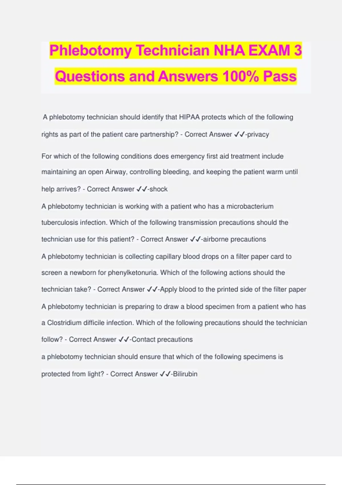 Phlebotomy Technician NHA EXAM 3 Questions and Answers 100% Pass A phlebotomy technician should identify that HIPAA protects which of the following rights as part of the patient care partnership? - Correct Answer ️️ -privacy For which of the following conditions does emergency first aid treatment include maintaining an open Airway, controlling bleeding, and keeping the patient warm until help arrives? - Correct Answer ️️ -shock A phlebotomy technician is working with a patient who has a microbacterium tuberculosis infection. Which of the following transmission precautions should the technician use for this patient? - Correct Answer ️️ -airborne precautions A phlebotomy technician is collecting capillary blood drops on a filter paper card to screen a newborn for phenylketonuria. Which of the following actions should the technician take? - Correct Answer ️️ -Apply blood to the printed side of the filter paper A phlebotomy technician is preparing to draw a blood specimen from a patient who has a Clostridium difficile infection. Which of the following precautions should the technician follow? - Correct Answer ️️ -Contact precautions a phlebotomy technician should ensure that which of the following specimens is protected from light? - Correct Answer ️️ -Bilirubin ( a bilirubin specimen is photosensitive. Therefore, the technician should protect the specimen from Light by wrapping the specimen in aluminum foil.) A phlebotomy technician is exposed to blood via a needle stick injury. Within how many hours should the technician initiate postexposure prophylaxis (PEP)? - Correct Answer ️️ -24 hr A phlebotomy technician is preparing to collect a Time medication draw ordered for 1400. The technician should verify when the patient received his previous dose of medication with which of the following members of the interprofessional team? - Correct Answer ️️ -Nurse A phlebotomy technician is preparing to collect a blood specimen from a patient who states he his HIV positive. which of the following actions should the technician take? - Correct Answer ️️ -Perform the venipuncture A phlebotomy technician is selecting a site for a blood draw from a patient. From which of the following vein should the technician attempt to draw first? - Correct Answer ️️ - Median cubital A phlebotomy technician uses a sterile technique and demonstrates proper hygiene. Which of the following professional characteristics is the technician displaying? - Correct Answer ️️ -Attention to cleanliness A patient who has diabetes states that he prefers to be drawn on the inside of his wrist. Which of the following actions should a phlebotomy technician take? - Correct Answer ️️ -Attempt to draw from the antecubital regio