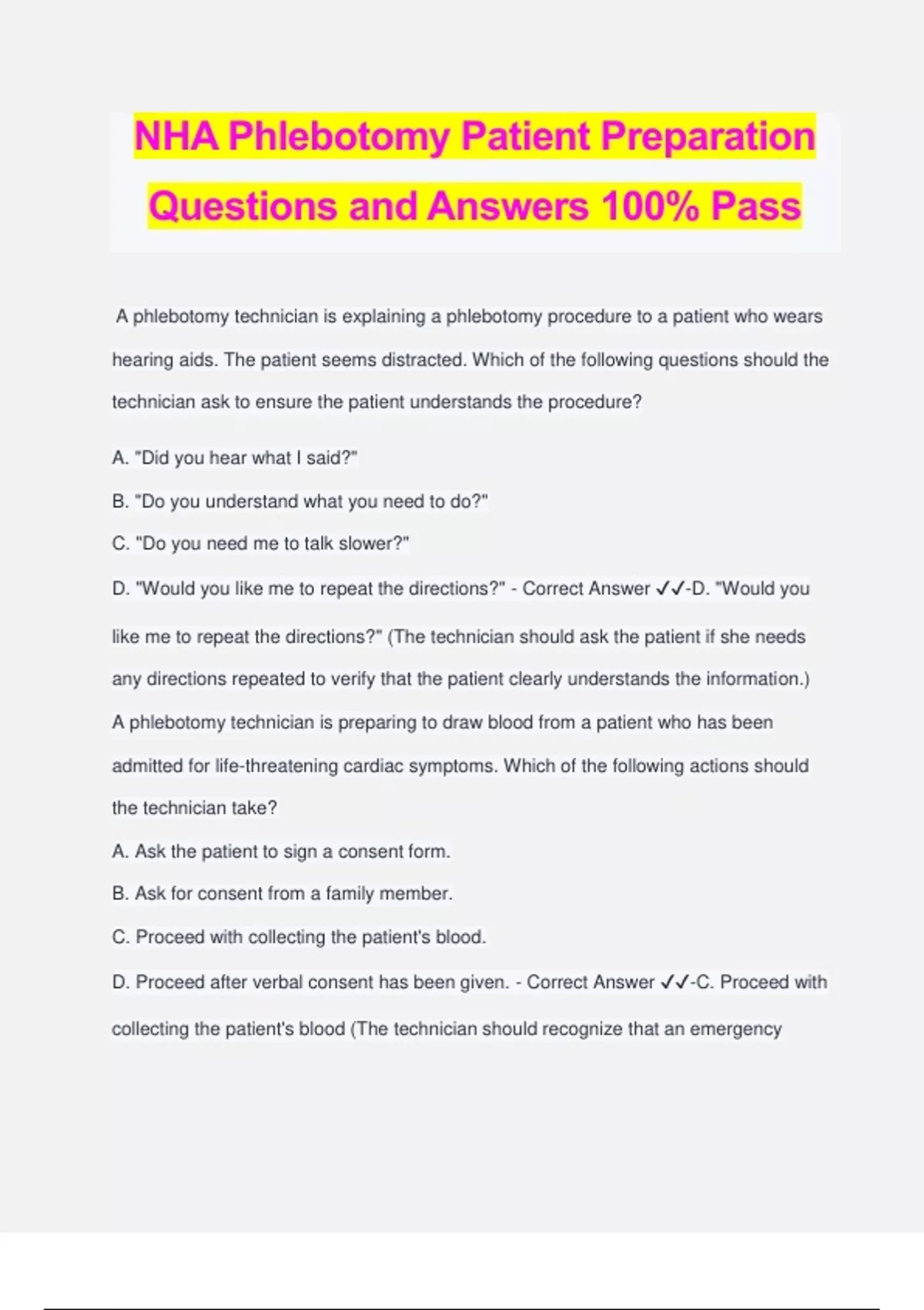 NHA Phlebotomy Patient Preparation Questions and Answers 100% Pass A phlebotomy technician is explaining a phlebotomy procedure to a patient who wears hearing aids. The patient seems distracted. Which of the following questions should the technician ask to ensure the patient understands the procedure? A. "Did you hear what I said?" B. "Do you understand what you need to do?" C. "Do you need me to talk slower?" D. "Would you like me to repeat the directions?" - Correct Answer ️️ -D. "Would you like me to repeat the directions?" (The technician should ask the patient if she needs any directions repeated to verify that the patient clearly understands the information.) A phlebotomy technician is preparing to draw blood from a patient who has been admitted for life-threatening cardiac symptoms. Which of the following actions should the technician take? A. Ask the patient to sign a consent form. B. Ask for consent from a family member. C. Proceed with collecting the patient's blood. D. Proceed after verbal consent has been given. - Correct Answer ️️ -C. Proceed with collecting the patient's blood (The technician should recognize that an emergency situation removes the need for consent. Therefore, the technician should proceed with the blood collection.) A phlebotomy technician is educating a patient about a 24-hr urine collection. Which of the following instructions should the technician give to the patient? A "Avoid mixing or inverting the container after collecting the specimen." B. "Start collecting at the second void of the day." C. "Reduce fluid intake during the 24-hour time frame." D. "Store the specimen at room temperature." - Correct Answer ️️ -B. "Start collecting at the second void of the day." (The patient should use the second void of the day to begin the 24-hr urine collection. The exact time should be written on the container label.) A phlebotomy technician should identify that which of the following information is required for positive identification of a patient in an outpatient facility? A. Attached ID band, full name, accession number B. Picture ID, full name, date of birth C. Accession number, full name, date of birth D. Medical requisition number, full name, date of draw - Correct Answer ️️ -B. Picture ID, full name, date of birth (For patient identification in an outpatient facility, the technician must have one piece of visual identification and two instances of verbal confirmation of identification. When providing verbal confirmation of their name, the client must state and spell their full name.) A phlebotomy technician is preparing to collect specimens to determine a patient's peak and trough levels of a medication. Which of the following actions should the technician take? A. Ask the patient when he received the medication. B. Perform the draw at the time assigned on the requisition form. C. Ask the nurse when the medication was administered. D. Perform the draw as soon as possible after breakfast. - Correct Answer ️️ -C. Ask the nurse when the medication was administered. (The technician should verify the time of administration with a nurse prior collecting the specimens to determine the patient's peak and trough levels.) A phlebotomy technician is processing the blood sample of a patient who ate a meal of meat and cheese prior to the draw. Following centrifugation of the sample, which of the following findings should the technician expect? A. The specimen does not coagulate. B. The specimen is hemolyzed. C. The specimen has a buffy coat. D. The specimen is lipemic. - Correct Answer ️️ -D. The specimen is lipemic (A lipemic specimen indicates that the patient has eaten fatty foods. If a specimen is lipemic, it will appear cloudy.) A phlebotomy technician is preparing to collect blood from a patient who has experienced syncope during previous draws. Which of the following actions should the technician take? A. Draw from the patient's hand. B. Place the patient in a supine position. C. Place the patient in a prone position. D. Perform a capillary draw. - Correct Answer ️️ -B. Place the patient in a supine position. (The technician should place the patient in a supine position to reduce the risk of her falling if she experiences syncope.) A phlebotomy technician is preparing to collect a specimen from a 3-year-old patient to perform a coagulation test. Which of the following collection methods should the technician use? A. Finger stick B. Heel stick C. Winged safety butterfly D. Evacuated tube system - Correct Answer ️️ -C. Winged safety butterfly (The technician should use a winged safety butterfly device when collecting a specimen from a 3-year-old patient to perform a coagulation test. This method is best for patients who have small veins, such as young children.) A phlebotomy technician is preparing to draw a patient's blood when the patient informs him that she is taking warfarin. The technician should identify that the results of which of the following tests is affected by this medication? A. PT/INR B. HDL C. Thyroid-stimulating hormone (TSH) D. LDL - Correct Answer ️️ -A. PT/INR (Taking an anticoagulant medication, such as warfarin, can affect PT/INR levels.)