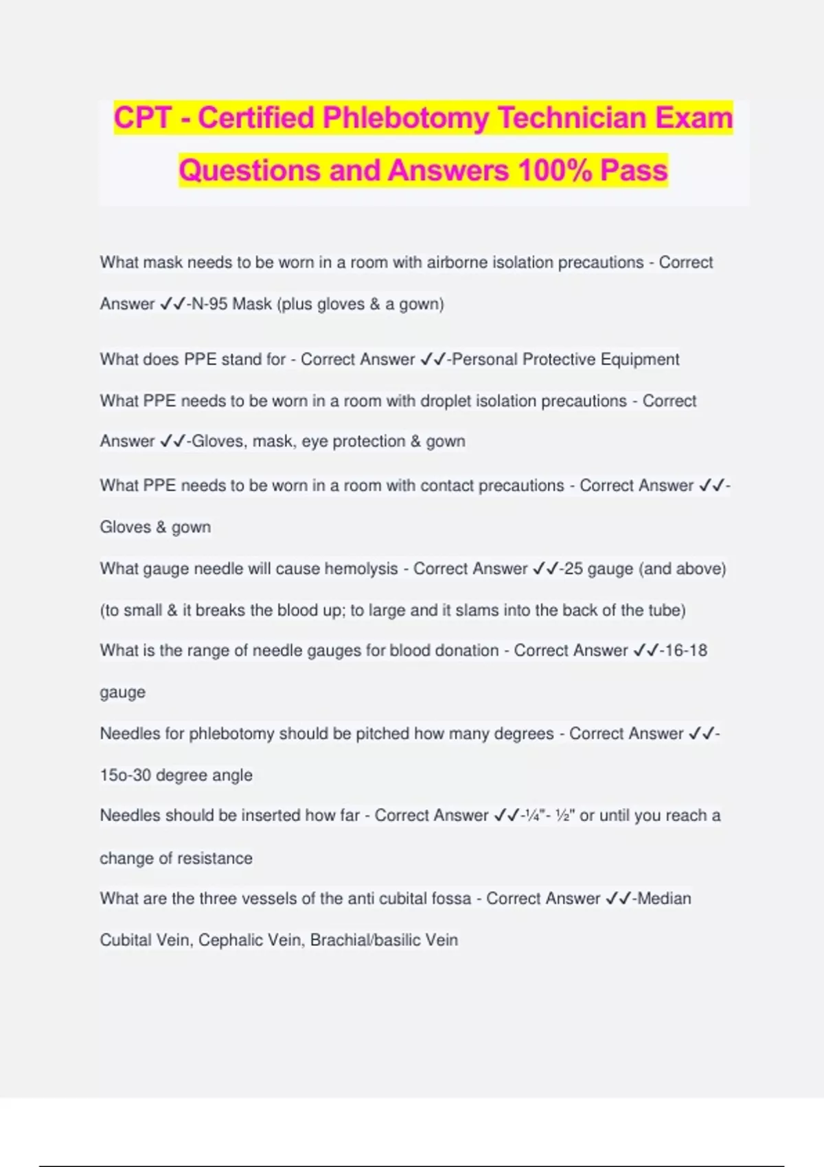 CPT - Certified Phlebotomy Technician Exam Questions and Answers 100% Pass What mask needs to be worn in a room with airborne isolation precautions - Correct Answer ️️ -N-95 Mask (plus gloves & a gown) What does PPE stand for - Correct Answer ️️ -Personal Protective Equipment What PPE needs to be worn in a room with droplet isolation precautions - Correct Answer ️️ -Gloves, mask, eye protection & gown What PPE needs to be worn in a room with contact precautions - Correct Answer ️️ - Gloves & gown What gauge needle will cause hemolysis - Correct Answer ️️ -25 gauge (and above) (to small & it breaks the blood up; to large and it slams into the back of the tube) What is the range of needle gauges for blood donation - Correct Answer ️️ -16-18 gauge Needles for phlebotomy should be pitched how many degrees - Correct Answer ️️ - 15o-30 degree angle Needles should be inserted how far - Correct Answer ️️ -¼"- ½" or until you reach a change of resistance What are the three vessels of the anti cubital fossa - Correct Answer ️️ -Median Cubital Vein, Cephalic Vein, Brachial/basilic Vein Which vessel is the first choice for a blood draw - Correct Answer ️️ -Median Cubital Vein Which vessel is the second choice for a blood draw - Correct Answer ️️ -Cephalic Vein Which vessel is the third choice for a blood draw - Correct Answer ️️ -Brachial/basilic Vein Which vessel is lateral to the patient's body - Correct Answer ️️ -Cephalic Vein What are the names of the three main vessels of the body - Correct Answer ️️ -Veins, arteries, capillaries What are the microscopic blood vessels responsible for O2 exchange - Correct Answer ️️ -Capillaries How much blood is needed for each blood culture bottle - Correct Answer ️️ -Adults: 8- 10ml (3-4ml in each bottle, aerobic & anaerobic) How many liters of blood does the average adult have - Correct Answer ️️ -5 (4-6 liters) What is the name of the part of the blood which suspends all of its whole material - Correct Answer ️️ -Plasma What is serum - Correct Answer ️️ -Plasma without the clotting factor What type of anemia can occur in infants because of frequent excessive blood drawing - Correct Answer ️️ -Iatrogenic anemia What is the lifespan of an RBC - Correct Answer ️️ -90-120 days What does CBC stand for - Correct Answer ️️ -Complete blood count What is a CBC with differential - Correct Answer ️️ -measures the levels of red blood cells, white blood cells, platelet levels, hemoglobin and hematocrit What are responsible for forming clots - Correct Answer ️️ -Platelets (Thrombocytes) What element of the blood is responsible for achieving hemostasis - Correct Answer ️️ -Platelets What is the term for an increase in the number of formed elements of blood due to a decrease in plasma - Correct Answer ️️ -Hemoconcentration If an emergency arises during a blood draw, what is the first action of the phlebotomist - Correct Answer ️️ -Stop What is the maximum time length a tourniquet can be left on - Correct Answer ️️ -60 seconds What is the term for when bleeding has stopped - Correct Answer ️️ -Hemostasis Hemostasis does what to the vessels - Correct Answer ️️ -Stops bleeding What is the medical term for a fainting episode - Correct Answer ️️ -Syncope What are some examples of emergencies during a blood draw - Correct Answer ️️ - Stroke, syncope, heart attack, choking, shock, seizure