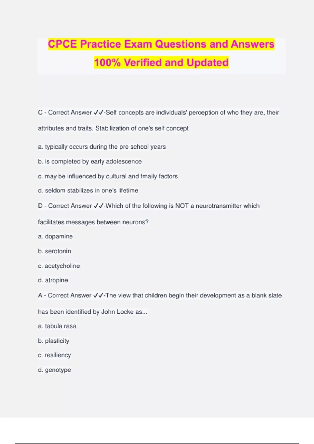 CPCE Practice Exam Questions and Answers 100% Verified and Updated C - Correct Answer ️️ -Self concepts are individuals' perception of who they are, their attributes and traits. Stabilization of one's self concept a. typically occurs during the pre school years b. is completed by early adolescence c. may be influenced by cultural and fmaily factors d. seldom stabilizes in one's lifetime D - Correct Answer ️️ -Which of the following is NOT a neurotransmitter which facilitates messages between neurons? a. dopamine b. serotonin c. acetycholine d. atropine A - Correct Answer ️️ -The view that children begin their development as a blank slate has been identified by John Locke as... a. tabula rasa b. plasticity c. resiliency d. genotype D - Correct Answer ️️ -According to Erikson, young adults seek close relationships with others but fear that doing so would mean giving up independence. Erikson called this tension a. adaptation vs. accommodation b. formal vs. concrete developpment c. autonomy vs. shame and doubt d. intimacy vs. isolation C - Correct Answer ️️ -Justin's fmaily moved to anew school district in October of the school year. His teacher noticed that although his verbal skills were well developed, he was not particularly interested in interacting and playing with other children his age. Justin seemed preoccupied with anything with wheels and would try to determine what made them turn. Often the teacher would see Justin make turning movements with his hands or arms. The teacher decided to refer Justin to the school psychologist for assessment. It may be that Justin has... a. attention deficit/hyperactivity disorder b. autistic disorder c. Asperger's disorder d. obsessive compulsive disorder C - Correct Answer ️️ -Which of the following is a true statement pertaining to the DSM-5? a. all major categories of disorders have been renamed b. there is less emphasis on pathopsychological origin of symptoms and behavior The axial classification system has been dropped d. Autism and Asperger's are classified under disruptive impulse control disorders D - Correct Answer ️️ -According to behaviorists, the law of effect most nearly refers to... a. hierarchy of needs b. defense mechanisms c. psychosexual development d. conditioning principles B - Correct Answer ️️ -Strong interpersonal relationships are often forged by individuals working for the same company. Not infrequently marriages are the result of some of these relationships. The principle involved here is called... a. adaptation b. propinquity c. commitment d. accommodation A - Correct Answer ️️ -Frequently a mental status exam is administered to an individual seeking mental health services. This formal assessment process covers several specific areas. Which of the following is NOT one of those areas? a. interpersonal relationships b. mood and affect c. appearance and behavior d. sensorium B - Correct Answer ️️ -Albert Bandura developed a social learning theory and self efficacy is one of the principal concepts. Self efficacy is the belief that we can do some task or behavior. As counselors, we need to be able to empower clients to become more self efficacious. Which one of the following is NOT an approach recommended by Bandura? a. vicarious experience b. raising anxiety level c. modeling d. verbal persuasion B - Correct Answer ️️ -A professional counselor determines fees for monthly consultations services on a job by job basis. This is an example of which of the following types of reinforcement schedules?