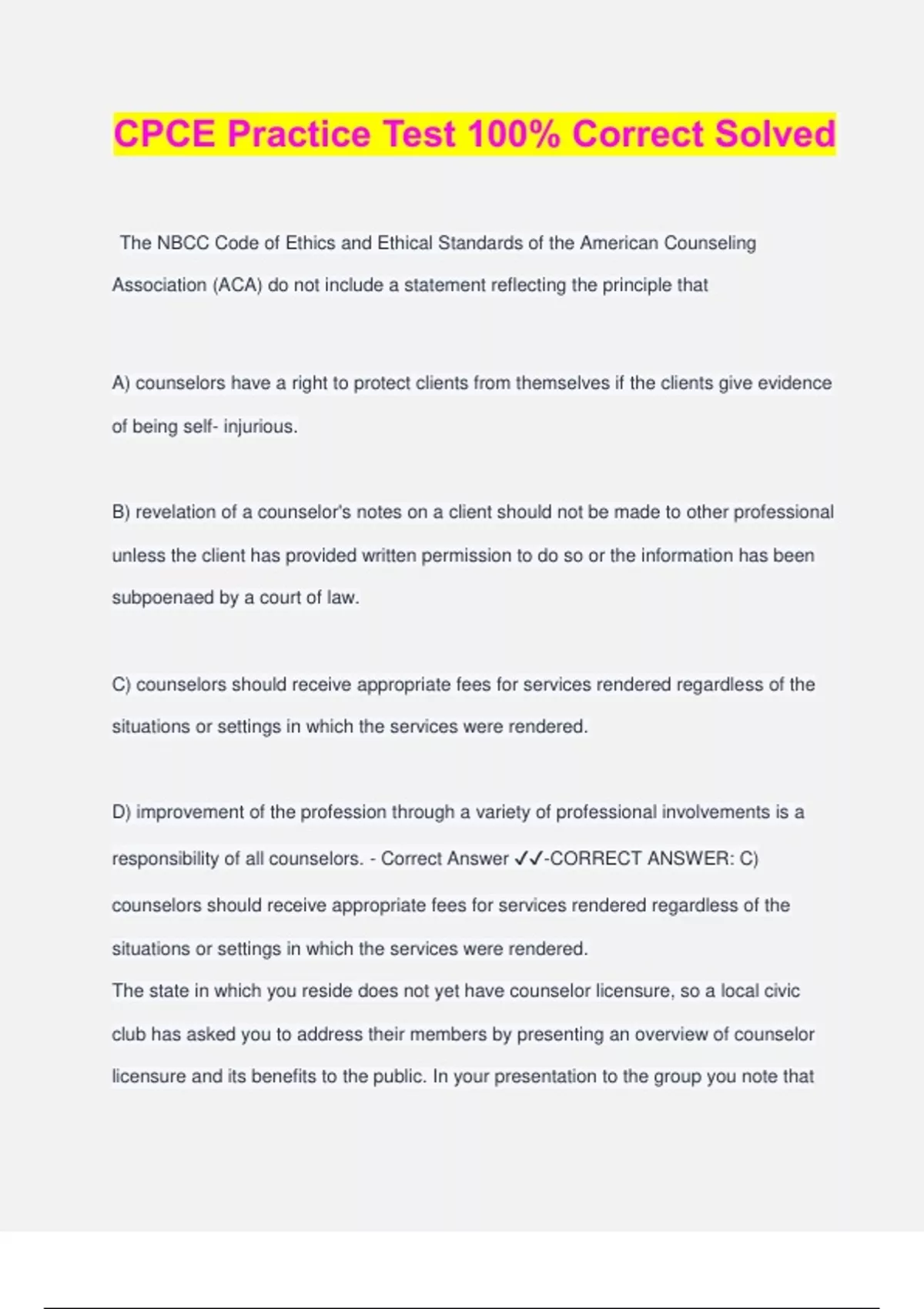 CPCE Practice Test 100% Correct Solved The NBCC Code of Ethics and Ethical Standards of the American Counseling Association (ACA) do not include a statement reflecting the principle that A) counselors have a right to protect clients from themselves if the clients give evidence of being self- injurious. B) revelation of a counselor's notes on a client should not be made to other professional unless the client has provided written permission to do so or the information has been subpoenaed by a court of law. C) counselors should receive appropriate fees for services rendered regardless of the situations or settings in which the services were rendered. D) improvement of the profession through a variety of professional involvements is a responsibility of all counselors. - Correct Answer ️️ -CORRECT ANSWER: C) counselors should receive appropriate fees for services rendered regardless of the situations or settings in which the services were rendered. The state in which you reside does not yet have counselor licensure, so a local civic club has asked you to address their members by presenting an overview of counselor licensure and its benefits to the public. In your presentation to the group you note that A) licensure automatically entitles counselors to receive third- party payments from insurance companies. B) some professional groups (e.g., psychologists) have opposed counselor licensure although the need for mental health services for the public has increased steadily. C) state-level counselor licensure laws have existed for over 40 years although it is only recently that a majority of the states have counselor licensure laws. D) one of the ways that counselor licensure laws protect the public's general welfare is through restriction of the use of the term "counselor" to those persons who have graduated from counselor education programs. - Correct Answer ️️ -CORRECT ANSWER: B) some professional groups (e.g., psychologists) have opposed counselor licensure although the need for mental health services for the public has increased steadily. A client has concluded a series of counseling sessions with another counselor and has now come to you for counseling. According to the NBCC ethical standards, you should A) proceed as you would with any other new client. B) contact the other counselor and find out if it is appropriate for you to counsel the client. C) contact the other counselor to ensure that you do not cover the same topic areas with the client. D) advise the client to continue with the other counselor. - Correct Answer ️️ - CORRECT ANSWER: A) proceed as you would with any other new client. Your employer has a policy which necessitates that you report all instances of child abuse to state authorities. A client alludes (in your judgment) to the possibility of (the client) being a child abuser. As a counselor you should A) contact your lawyer; the policy is a violation of the "fair trade" laws. B) refer the person elsewhere; receipt of a salary constitutes voluntary agreement with the employer's policies. C) inform the client of the policy and let the client decide how to proceed. D) contact a consultant; then do as the consultant suggests. - Correct Answer ️️ - CORRECT ANSWER: C) inform the client of the policy and let the client decide how to proceed. A married couple comes to you, as a counselor in private practice and tells you that they are having marital difficulties and have sought counseling for resolution of them. In the course of an initial session with them, one of the spouses reports being a new and active member of the local Alcoholics Anonymous (AA~) group. You should A) investigate the nature of the local AA's activities and continue counseling if those activities do not include accepted definitions of counseling. B) terminate counseling with the one spouse but continue to work with the spouse who is not an AA participant. C) offer to co-counsel with the staff of the local AA. D) refer both spouses to the local AA. - Correct Answer ️️ -CORRECT ANSWER: A) investigate the nature of the local AA's activities and continue counseling if those activities do not include accepted definitions of counseling. A member of the local clergy telephones and asks for your evaluation of the spiritual values of a person whom the caller knows was one of your clients. The caller wants your opinion because the former client is an applicant to a theological institution for which the caller is the local applicant evaluator. You should a. respond orally but require that no records be made of the conversation and that no comments be attributed to you. b. inform the caller that under no circumstances are you ethically permitted to divulge whether a person is or has been a client or any information about a client without the client's permission. c. inform the caller that you need to call the former client and obtain the client's permission before you can express your opinions. d. seek the counsel of your supervisor to determine what types of information it would be permissible to divulge. - Correct Answer ️️ -b. inform the caller that under no circumstances are you ethically permitted to divulge whether a person is or has been a client or any information about a client without the client's permission. You have been providing career counseling to a client who is seeking employment. Concurrent to the counseling, and with your knowledge, the client has made application for employment with several employers. A potential employer calls you and asks for your opinion as to your client's suitability for the employer's job opening. Under which of the following conditions are you free (i.e., not in violation of professional ethics) to provide the information requested? a. when it is clear that the client will not get the job unless the information is given b. when you are certain that the information you would provide would assure that the client would get the job c. when in your best judg