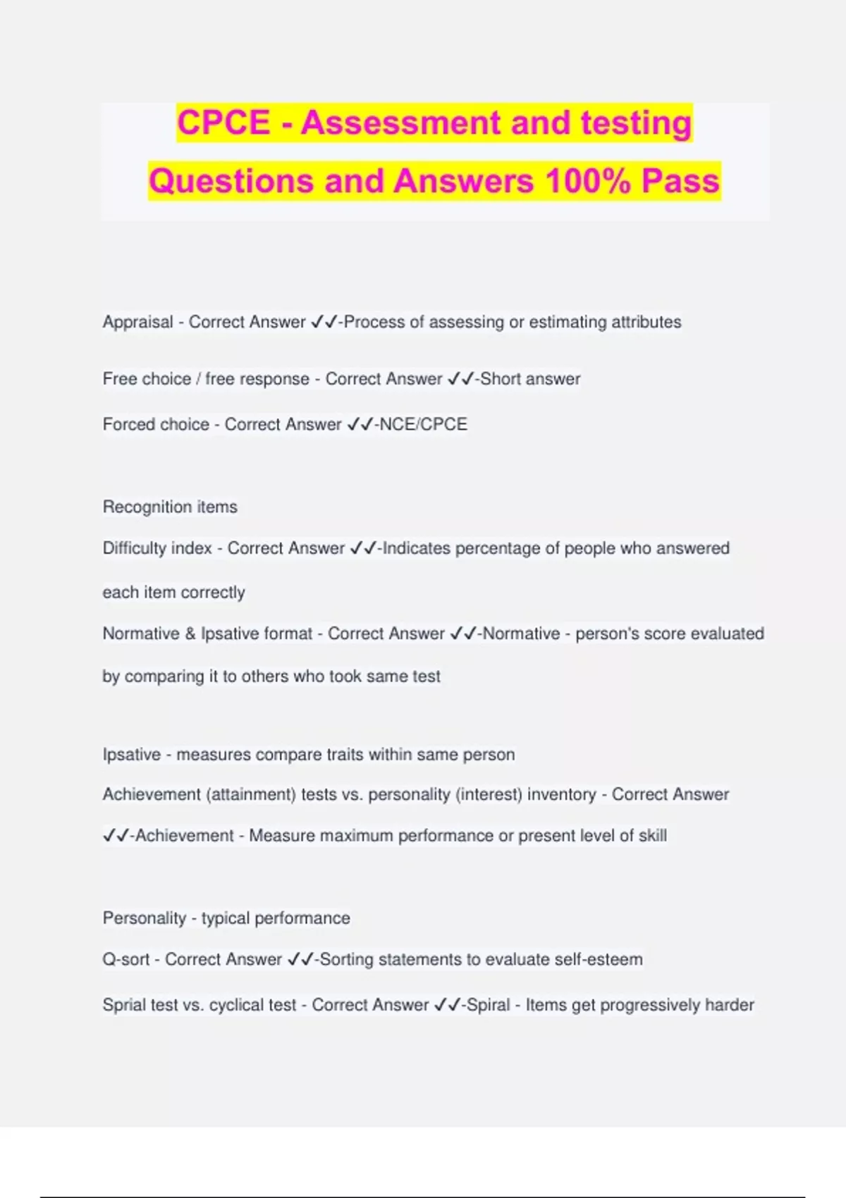 CPCE - Assessment and testing Questions and Answers 100% Pass Appraisal - Correct Answer ️️ -Process of assessing or estimating attributes Free choice / free response - Correct Answer ️️ -Short answer Forced choice - Correct Answer ️️ -NCE/CPCE Recognition items Difficulty index - Correct Answer ️️ -Indicates percentage of people who answered each item correctly Normative & Ipsative format - Correct Answer ️️ -Normative - person's score evaluated by comparing it to others who took same test Ipsative - measures compare traits within same person Achievement (attainment) tests vs. personality (interest) inventory - Correct Answer ️️ -Achievement - Measure maximum performance or present level of skill Personality - typical performance Q-sort - Correct Answer ️️ -Sorting statements to evaluate self-esteem Sprial test vs. cyclical test - Correct Answer ️️ -Spiral - Items get progressively harder Cyclical - several sections which are spiral Test battery - Correct Answer ️️ -Horizontal test - measures various factors (ex: math & science) during same testing procedure Which is more important, validity or reliability? - Correct Answer ️️ -Validity - a test must measure what it means to measure Types of validity - Correct Answer ️️ -Content - does the test examine the behavior under scrutiny? Construct - test's ability to measure a theoretical construct like intelligence Concurrent - how well the test compares to other instruments that are intended for the same purpose Predictive (empirical) - test's ability to predict future behavior according to criteria Consequential - social implications of using tests * criterion validity - concurrent validity and predictive validity together Incremental vs. synthetic validity - Correct Answer ️️ -Incremental - process by which a test is refined and becomes more valid as contradictory items are dropped Synthetic - helper looks for tests that have been shown to predict each job element or component Convergent vs. discriminant validity - Correct Answer ️️ -Convergent - correlating test scores with an outside source Discriminant - test will not reflect unrelated variables Reliability coefficient of .70 means - Correct Answer ️️ -70% of the score is accurate and 30% is inaccurate True variance or coefficient of determination - Correct Answer ️️ -Square the coefficient Ex: Correlation of .70 .... .70 x .70 = .49 and .49 x 100 = 49% First IQ test - Correct Answer ️️ -Alfred Binet and Theodore Simon MA/CA x 100 IQ formula replaced by SAS (standard age score) Wechsler IQ - Correct Answer ️️ -More for adults than Binet