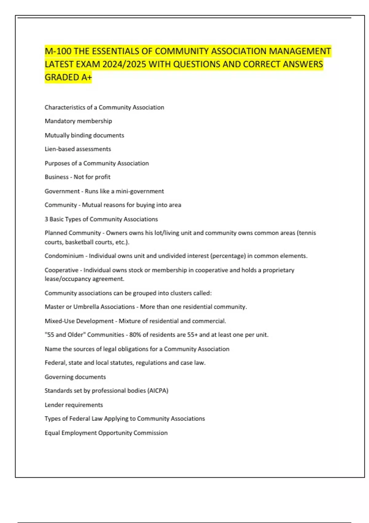 M-100 THE ESSENTIALS OF COMMUNITY ASSOCIATION MANAGEMENT LATEST EXAM 2024/2025 WITH QUESTIONS AND CORRECT ANSWERS GRADED A+