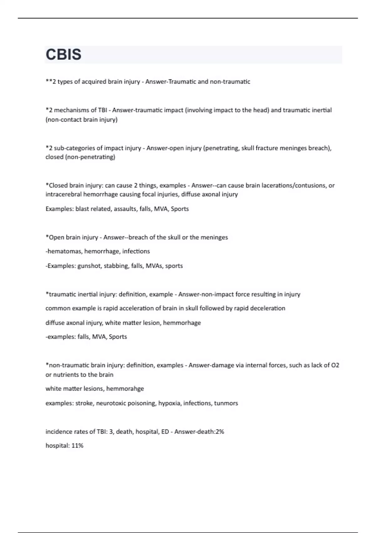 **2 types of acquired brain injury - Answer-Traumatic and non-traumatic *2 mechanisms of TBI - Answer-traumatic impact (involving impact to the head) and traumatic inertial (non-contact brain injury) *2 sub-categories of impact injury - Answer-open injury (penetrating, skull fracture meninges breach), closed (non-penetrating) *Closed brain injury: can cause 2 things, examples - Answer--can cause brain lacerations/contusions, or intracerebral hemorrhage causing focal injuries, diffuse axonal injury Examples: blast related, assaults, falls, MVA, Sports *Open brain injury - Answer--breach of the skull or the meninges -hematomas, hemorrhage, infections -Examples: gunshot, stabbing, falls, MVAs, sports *traumatic inertial injury: definition, example - Answer-non-impact force resulting in injury common example is rapid acceleration of brain in skull followed by rapid deceleration diffuse axonal injury, white matter lesion, hemmorhage -examples: falls, MVA, Sports *non-traumatic brain injury: definition, examples - Answer-damage via internal forces, such as lack of O2 or nutrients to the brain white matter lesions, hemmorahge examples: stroke, neurotoxic poisoning, hypoxia, infections, tunmors incidence rates of TBI: 3, death, hospital, ED - Answer-death:2% hospital: 11%ED visit: 87% how much of US pop living with BI - Answer-13.5 million 4.5 % of pop *primary vs secondary injury - Answer-primary: initial, mechanical damage secondary: "cascade" pathophysiological processes, delay non-mechanical processes determining effects of brain injury (7) - Answer-injury severity age of injury alcohol misuse DV Service in military participation in sports if had injury previously *mild TBI: definition, may demonstrate (5) - Answer-brief or no loss of consciousness vomiting lethargy dizziness unable to recall what just happened