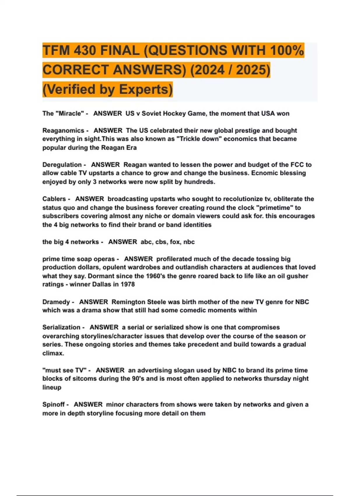 The "Miracle" - ANSWER US v Soviet Hockey Game, the moment that USA won Reaganomics - ANSWER The US celebrated their new global prestige and bought everything in sight.This was also known as "Trickle down" economics that became popular during the Reagan Era Deregulation - ANSWER Reagan wanted to lessen the power and budget of the FCC to allow cable TV upstarts a chance to grow and change the business. Ecnomic blessing enjoyed by only 3 networks were now split by hundreds.