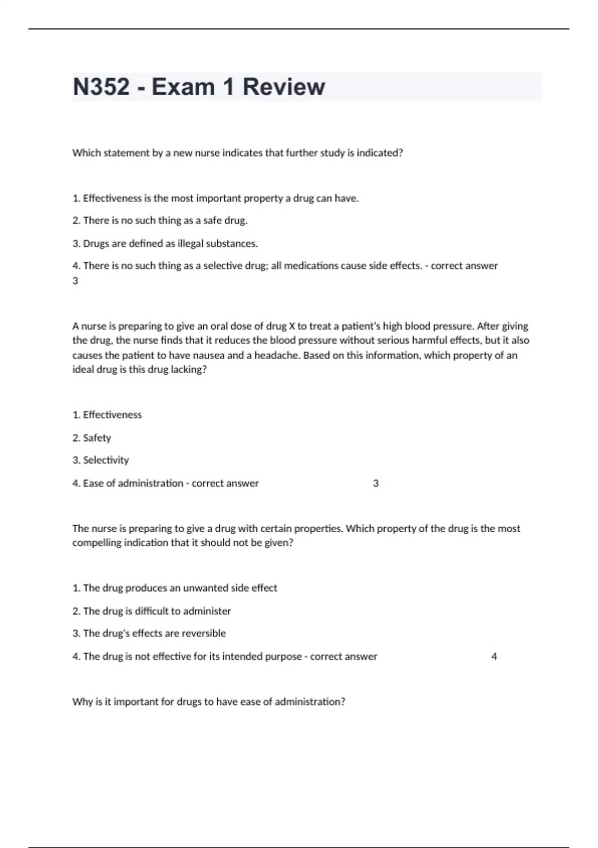 Which statement by a new nurse indicates that further study is indicated? 1. Effectiveness is the most important property a drug can have. 2. There is no such thing as a safe drug. 3. Drugs are defined as illegal substances. 4. There is no such thing as a selective drug; all medications cause side effects. - correct answer 3 A nurse is preparing to give an oral dose of drug X to treat a patient's high blood pressure. After giving the drug, the nurse finds that it reduces the blood pressure without serious harmful effects, but it also causes the patient to have nausea and a headache. Based on this information, which property of an ideal drug is this drug lacking? 1. Effectiveness 2. Safety 3. Selectivity 4. Ease of administration - correct answer 3 The nurse is preparing to give a drug with certain properties. Which property of the drug is the most compelling indication that it should not be given? 1. The drug produces an unwanted side effect 2. The drug is difficult to administer 3. The drug's effects are reversible 4. The drug is not effective for its intended purpose - correct answer 4 Why is it important for drugs to have ease of administration? 1. Fewer administration errors 2. Less risk of side effects 3. Greater chemical stability 4. Greater likelihood of reversibility - correct answer 1 What is the ultimate concern for the nurse when administering a drug? 1. Intensity of the response 2. Dosage 3. Route of administration 4. Timing of administration - correct answer 1 The nurse teaches a patient not to consume alcohol with nitroglycerine, because the blood pressure often drops significantly when nitroglycerine is taken with alcohol. Which drug property does this illustrate? 1. Chemical instability 2. Drug interaction 3. Reversible action 4. Drug selectivity - correct answer 2 When studying the impact a drug has on the body, the nurse is reviewing what? 1. The drug's pharmacokinetics 2. The drug's selectivity 3. The drug's pharmacodynamics 4. The drug's predictability - correct answer 3 Characteristics unique to each patient can influence pharmacokinetic and pharmacodynamic processes. What characteristics may determine the patient's response to a drug? Select all that apply. 1. Age 2. Gender 3. Weight 4. Mood 5. Genetics - correct answer 1, 2, 3 When studying the effects of drugs in humans, the nurse is learning about what? 1. Pharmacology 2. Clinical pharmacology 3. Therapeutics 4. Effectiveness - correct answer 2 What is the objective of drug therapy? 1. Provide maximum benefit with minimal harm 2. Provide minimum benefit with maximum harm 3. Provide total relief of symptoms regardless of harm 4. Provide as much benefit as possible - correct answer 1 Which statements about medication administration would the nurse identify as true? Select all that apply. 1. All drugs have the potential to produce undesired effects. 2. Drug therapy often can be enhanced by nonpharmacologic measures. 3. Patients taking two drugs are not likely to have a drug interaction. 4. Nurses' knowledge of pharmacology is more important for standing orders than for PRN medications. 5. Patient adherence is essential in achieving the therapeutic objective of medications. - correct answer 1, 2, 5 The nurse is preparing to administer a dose of penicillin. Before administering the medication, the nurse assesses the patient's allergy history. Which aspect of drug therapy does this represent? 1. Making PRN (as needed) decisions 2. Evaluating therapeutic effects 3. Ensuring proper dosage 4. Identifying high-risk patients - correct answer 4 Which aspect of drug therapy indicates to the nurse whether a drug is having a beneficial effect? 1. Performing a preadministration assessment 2. Evaluating therapeutic responses 3. Minimizing adverse effects 4. Managing toxicity - correct answer 2 When educating patients about their medications, the nurse includes information about which topics? Select all that apply. 1. What to do if a dose is missed 2. The duration of treatment 3. Prescription drug coverage 4. The method of drug storage 5. Symptoms of adverse effects - correct answer 1, 2, 4, 5 A diabetic patient is taught the signs and symptoms of hypoglycemia with insulin use. The patient knows to eat fast-acting carbohydrates. This is an example of what goal? 1. Minimizing adverse effects 2. Promoting therapeutic effects 3. Minimizing adverse interactions 4. Managing toxicity - correct answer 1 The nurse is obtaining a drug history for a patient admitted to the unit. The nurse obtains information about past and present health histories, currently used prescription drugs, behavioral factors, and use of over-the-counter (OTC) drugs. What other information does the nurse need to obtain? Select all that apply. 1. Use of recreational drugs and substances 2. Usual sleep patterns and disturbances 3. Highest level of education completed 4. Use of herbal remedies 5. Self-treatment with complementary and alternative drugs - correct answer 1, 4, 5 The nurse identifies what as the goal of drug therapy in the treatment of patients? 1. Cure of the disease 2. Follow-up with the prescriber 3. Correct administration technique 4. Production of maximum benefit with minimum harm - correct answer 4 When questioning a patient about his or her allergic reaction to a drug, the nurse should ask for what additional information?