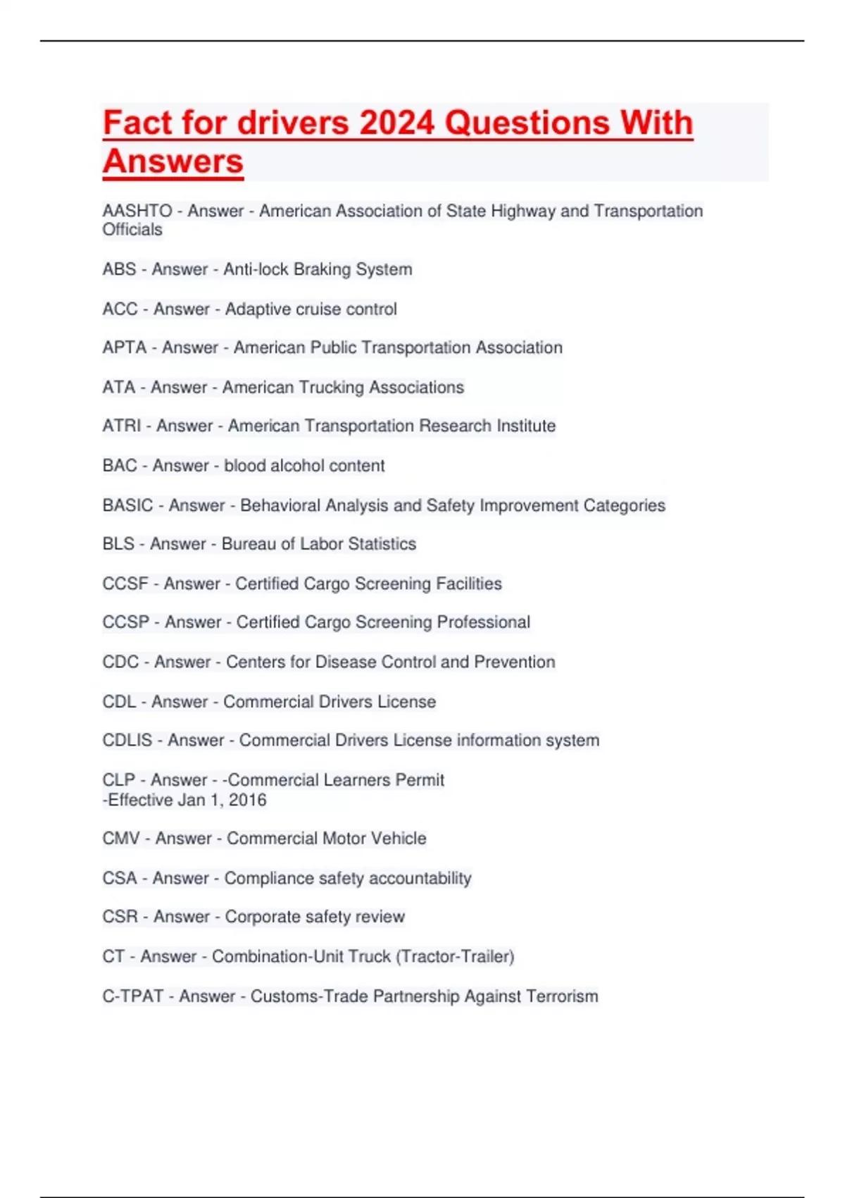 Facts for drivers study Test Questions And Correct Answers the professional truck driver today enjoys the position of being the safest, most knowledgeable and expedient driver on americas's street's and highways. - Answer -True a drivers reputation relies on? - Answer -Driving record. professionalism. and self discipline. The professional truck driver today enjoys the position of being the safest, most knowledgeable and expert driver on America's streets and highways. To achieve and maintain this status what should they not have to do? - Answer -They must study the ever changing issues governing the industry What is one of the most visible and successful safety initiatives of the trucking industry? - Answer -Championship Programs truck driving championships influence how many drivers annually? - Answer -Tens of Thousands National trucking associations, national truck roadeo was established in? - Answer -1937,1936,and 1938 The TDC was established by the ATA in? - Answer -1937 The overriding objectives of the Championships Program is threefold.1. to provide incentive for professional drivers to perfect their crafts. 2,improve the medias and general public image of truck drivers. 3, to provide incentive for professional drivers accident free. True or False? - Answer -False Which is NOT an objective of the TDC? 1,To Drive accident free 2,Perfect their crafts 3,Improve the medias and the general publics image of truck drivers and the motor carrier industry, 4,none of these - Answer -None Of These The state and national competitions consist of a written examination. All of the written exam questions are taken from the current Facts for Drivers Book. True or False? - Answer -True For the Pre-Trip portion of the competition, 10 minutes the minimum amount of time the contestant receives. True or False? - Answer -False The skills portion is NOT timed so the contestant can take their time to ensure they do a good job. True Or False? - Answer -False The only accidents which need not be counted against the contestants record are - Answer -The contestants vehicle was legally and properly parked, The contestants vehicle was stopped in traffic in compliance with a traffic sign, Waived by the NTDC Committee in accordants with specific, narrow guidelines. In order to complete the TDC, you must hold a CDL with proper endorsements as set by 49CFR section - Answer -Section 391.41 To be medically fit to drive, you must have a field vision of? - Answer -70 You must be able to hear a forced whisper? - Answer -no less than 5 To compete in the championships the driver must be employed for 11 out of the 12 months prior to entry in each event. True Or False? - Answer -False How many classes can a driver compete in each year? - Answer -1 A state champion can be disqualified from the NTDC if they do anything that mat be considered detrimental to the trucking industry. True Or False? - Answer -True In order for drivers to perform at their peak, they rely on? - Answer -Knowledge. Experience. Skills. In the early 1900's following the invention of the diesel powered internal combustion engine, trucks began to replace horse drawn carriages to deliver goods. True Or False? - Answer -False At the end of WWI there were over 1 million trucks, how many were there at the start of WWI? - Answer -300,000 Which boosted the growth of trucking? - Answer -WWI The pneumatic tire was introduced to trucking it? - Answer -1919 The diesel engine was introduced to trucking in? - Answer -1924