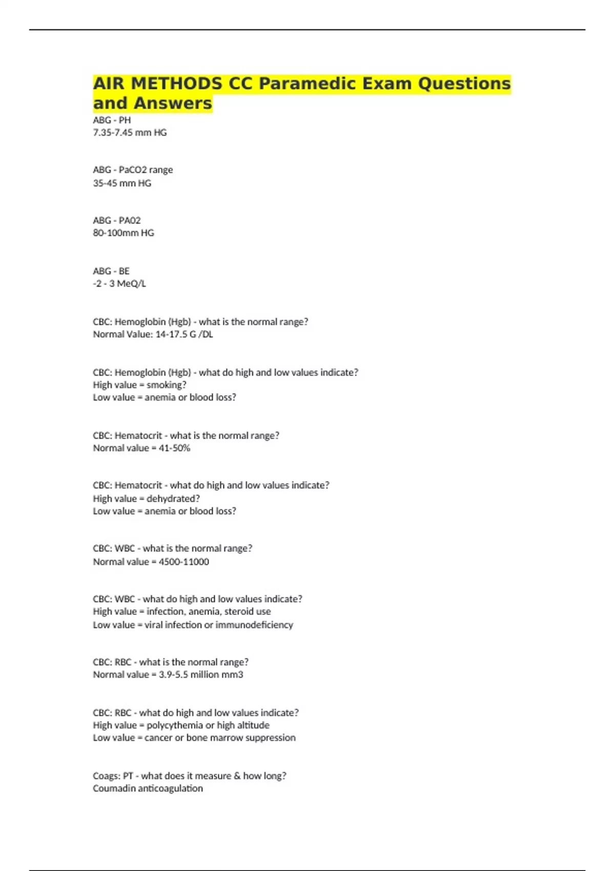 AIR METHODS CC Paramedic Exam Questions and Answers ABG - PH 7.35-7.45 mm HG ABG - PaCO2 range 35-45 mm HG ABG - PA02 80-100mm HG ABG - BE -2 - 3 MeQ/L CBC: Hemoglobin (Hgb) - what is the normal range? Normal Value: 14-17.5 G /DL CBC: Hemoglobin (Hgb) - what do high and low values indicate? High value = smoking? Low value = anemia or blood loss? CBC: Hematocrit - what is the normal range? Normal value = 41-50% CBC: Hematocrit - what do high and low values indicate? High value = dehydrated? Low value = anemia or blood loss? CBC: WBC - what is the normal range? Normal value = CBC: WBC - what do high and low values indicate? High value = infection, anemia, steroid use Low value = viral infection or immunodeficiency CBC: RBC - what is the normal range? Normal value = 3.9-5.5 million mm3 CBC: RBC - what do high and low values indicate? High value = polycythemia or high altitude Low value = cancer or bone marrow suppression Coags: PT - what does it measure & how long? Coumadin anticoagulation 10-13 second Coags: PT - what do high values indicate? High values can indicate liver cirrohsis, vitamin K deficiency or DIC Coags: INR International normalized ratio. Normal INR = 1.0. Coags: aPTT - what does it measure & how long? Measures Heparin 25-40 second OB: What are some physiological changes which occur in pregnancy? -Blood volume increases 40% -Plasma increases, showing false anemia on labs -BP decreases in 2nd trimester, but returns to normal -Cardiac output increases, up to 50% -HR increases 10-15 bpm -SBP increases -Body becomes more insulin resistant -Uterus enlarges 20x OB: Physical assessment of pregnant patient Palpate / Check vitals / Check FHT / Ask GP-PAL OB: What is GP-PAL Gravida, Para, Preterms, Abortion, Living children OB: Tx for distressed fetus? 100% O2 via NRB on mother; place in LLR; give fluids for hypotension and perform external vaginal exam OB: Vaginal bleeding - caused by? Ovarian cysts, spotting, fetal loss, ectopic pregnancy or uterine rupture OB: Vaginal bleeding - TX? O2/IV/Monitor Manage blood loss Blood products Tx for shock Monitor FHT OB: Gestational hypertension - TX? Treat with: -Beta Blockers like Labetalol -Arterial vasodilators like Hydrolozine -Consider seizure prophylaxis like 4G Mag over 20 min OB: Pre-eclampsia - S/S & TX? S/S = HTN with edema, neuro changes and clonus TX = -Beta Blockers like Labetalol -Arterial vasodilators like Hydrolozine -Consider seizure prophylaxis like 4G Mag over 20 min (Delivery is only option to stop condition) OB: Pre-eclampsia - severe S/S? BP 160/100 Pulmonary edema Platelets under 100k Headache/ vision changes RUQ pain Proteins in urine OB: Eclampsia - S/S & TX? S/S - HTN with seizures TX - Magnesium -4G bolus over 2 minutes; 2G Mag bolus if already administered. Consider Midazolam (2-5mg IM) if seizure continues OB: Placenta Previa - S/S? Painless, bright red bleeding No significant findings on abdomen exam OB: Abruptio Placentae - S/S & TX? Caused by Trauma, HTN, ETOH/drugs S/S = tearing, abdominal pain, vaginal bleeding. In severe cases, hemorrhagic shock and rigid abdomen TX = 100% O2 NRB, 2 IV's with volume replacement. Consider 4G Mag or steroid OB: Uterine Rupture - S/S and TX? S/S = sharp pain, hypovolemic chock, distention and possible bleeding TX = LLR, 100% O2, IV's and 4G Mag bolus OB: Prolapsed cord - TX Knees to chest, don't push, 100% O2, Keep cord moist, consider manual displacement if needed. Consider Nitro infusion of 2ug/min or 4G Mag bolus OB: Name the delivery presentations Cephalic, vertex - normal presentation Cephalic, face - head down, posterior, head not flexed Complete breech - feet first, indian style Incomplete breech - one foot presenting Transverse - (non deliverable) Butt first or sideways