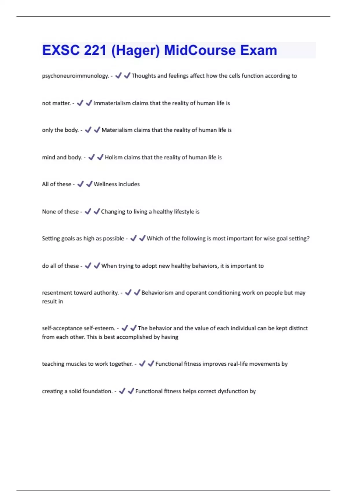psychoneuroimmunology. - Thoughts and feelings affect how the cells function according to not matter. - Immaterialism claims that the reality of human life is only the body. - Materialism claims that the reality of human life is mind and body. - Holism claims that the reality of human life is All of these - Wellness includes None of these - Changing to living a healthy lifestyle is Setting goals as high as possible - Which of the following is most important for wise goal setting? do all of these - When trying to adopt new healthy behaviors, it is important to resentment toward authority. - Behaviorism and operant conditioning work on people but may result in self-acceptance self-esteem. - The behavior and the value of each individual can be kept distinct from each other. This is best accomplished by having teaching muscles to work together. - Functional fitness improves real-life movements by creating a solid foundation. - Functional fitness helps correct dysfunction byproper alignment of the musculoskeletal system. - Good posture is the All of these - Good posture contributes to better posture. - Dynamic flexibility helps to maintain active - A pedometer reading of 10,000-14,000 steps a day is considered to be overall well-being including neurogenesis. - Cardiorespiratory fitness contributes to cardiorespiratory fitness. - VO2 max is a good predictor of awareness of the effects of hot and humid condition. - A healthy approach to improving cardiorespiratory wellness includes by measuring how far you can move in a given time - You can estimate your current cardiorespiratory fitness level static and dynamic flexibility. - The two types of flexibility are flexibility - The capacity to move a joint through its full range of motion is called improved posture and reduce risk of injury. - Health benefits of being flexible include everyone should ease into flexibility exercises and do some everyday. - The principle of progression, when applied to flexibility, means that flexibility is most effective when muscles are strong. - The relationship between flexibility and muscle strength dictates thatmuscle - Body tissue that can generate force is called cardiac, smooth, and skeletal. - Three types of muscle tissue in the body include contract repeatedly over time. - Muscular endurance is the ability of a muscle or muscle group to all of these - Muscle strength and endurance is capable of systolic and diastolic blood pressure. - Muscular fitness can help hypertensive individuals lower their trans fats - Hydrogenation converts unsaturated fats to a semisolid or solid form, and they become insulin levels in the blood - The glycemic index and glycemic load impact food stagnating and sending toxins into the bloodstream. - Stressors release hormones that slow down digestion resulting in