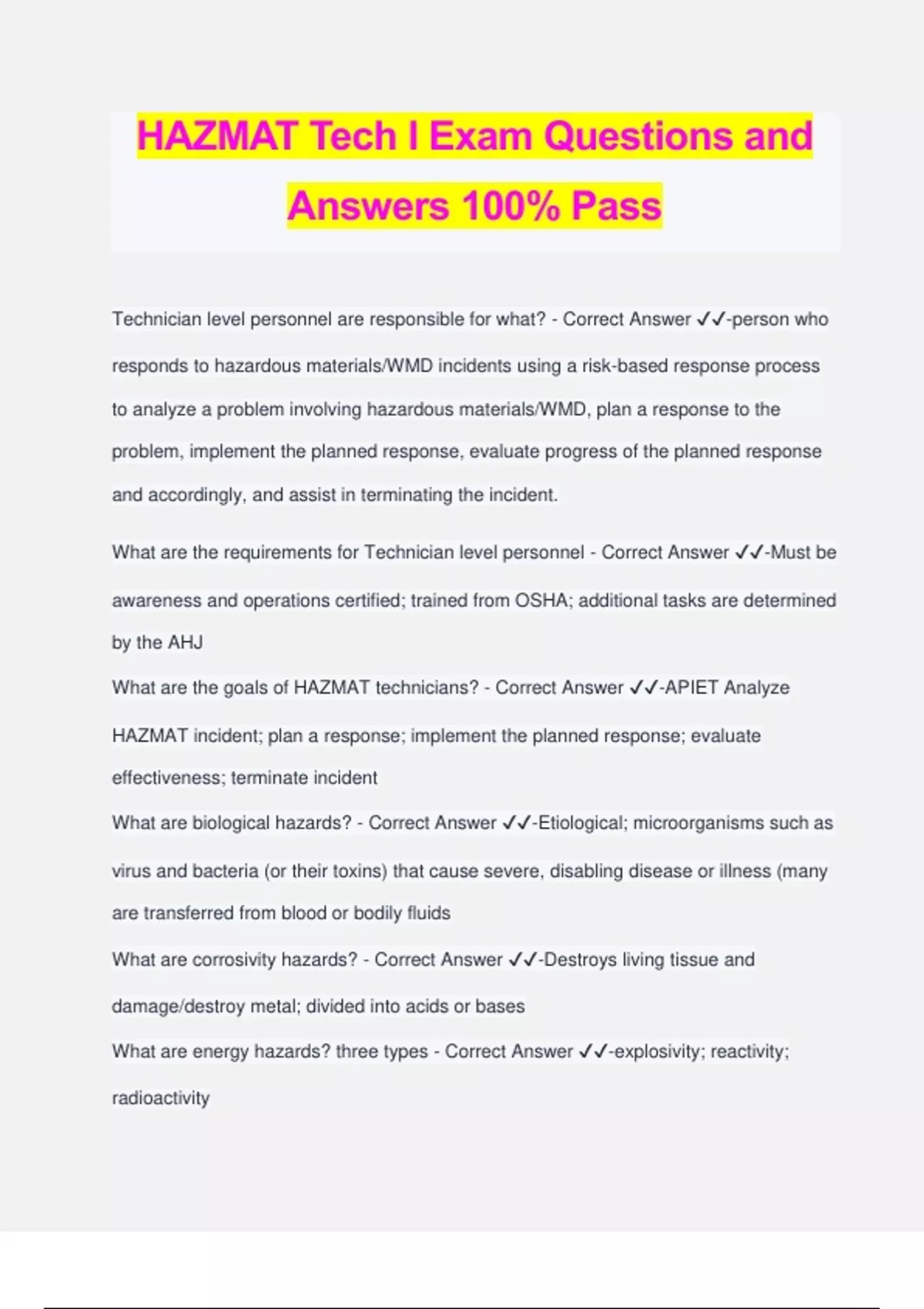 hazmat tech i exam questions and answers 100 pass