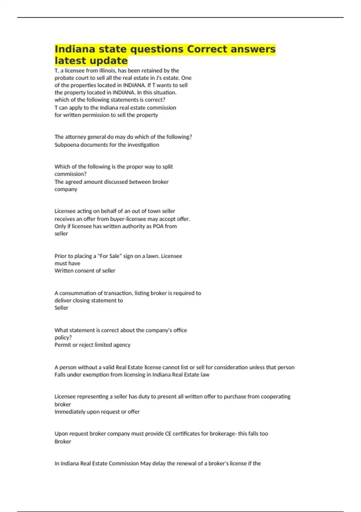 Indiana state questions Correct answers latest update T, a licensee from Illinois, has been retained by the probate court to sell all the real estate in J's estate. One of the properties located in INDIANA. If T wants to sell the property located in INDIANA. In this situation. which of the following statements is correct? T can apply to the Indiana real estate commission for written permission to sell the property The attorney general do may do which of the following? Subpoena documents for the investigation Which of the following is the proper way to split commission? The agreed amount discussed between broker company Licensee acting on behalf of an out of town seller receives an offer from buyer-licensee may accept offer. Only if licensee has written authority as POA from seller Prior to placing a "For Sale" sign on a lawn. Licensee must have Written consent of seller A consummation of transaction, listing broker is required to deliver closing statement to Seller What statement is correct about the company's office policy? Permit or reject limited agency A person without a valid Real Estate license cannot list or sell for consideration unless that person Falls under exemption from licensing in Indiana Real Estate law Licensee representing a seller has duty to present all written offer to purchase from cooperating broker Immediately upon request or offer Upon request broker company must provide CE certificates for brokerage- this falls too Broker In Indiana Real Estate Commission May delay the renewal of a broker's license if the Managing Broker has failed to provide the Commission with copies of the broker's continuing education certifications Inducements allowed Donate to charity of buyer/seller's choice with approval valid listing with Broker H. Broker M tells them to cancel and list with Broker M M's license can be revoked or suspended To qualify for commission Resident of district appointed to represent Seller y's sight is failing, They can't fill out the Residential Real Estate Disclosure form Inform Y it is her responsibility Advertises open house with drawing for free tv. Broker must disclose to All parties Broker Z is a member of an LLC that buys and sells investment properties. LLC lists property with Broker Q at another firm. Broker z Must disclose in writing Z's interest to all parties Must do 30 post licensing education Within 2 years Sarah has passed her broker exam and applied for licensure. What activities can she not perform? Explain amortization table A limited agent may disclose which of the following? Septic tank A broker in Indiana resides in the state of Michigan and is licensed as a real estate broker in Indiana. In this situation, the broker... Act as a broker associated with a managing broker in Indiana Broker hires an inactive broker to conduct open house The broker may face disciplinary action for incompetent practice. An individual must have a broker license to conduct which of the followings Conduct the sale of real property A broker has been hired to appraise a property being offered for sale. The broker must adhere to the uniform standards of professional appraising practice