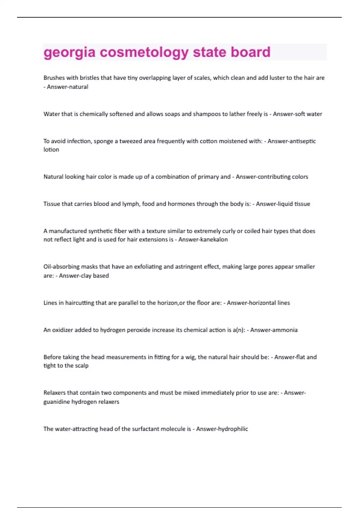 Brushes with bristles that have tiny overlapping layer of scales, which clean and add luster to the hair are - Answer-natural Water that is chemically softened and allows soaps and shampoos to lather freely is - Answer-soft water To avoid infection, sponge a tweezed area frequently with cotton moistened with: - Answer-antiseptic lotion Natural looking hair color is made up of a combination of primary and - Answer-contributing colors Tissue that carries blood and lymph, food and hormones through the body is: - Answer-liquid tissue A manufactured synthetic fiber with a texture similar to extremely curly or coiled hair types that does not reflect light and is used for hair extensions is - Answer-kanekalon Oil-absorbing masks that have an exfoliating and astringent effect, making large pores appear smaller are: - Answer-clay based Lines in haircutting that are parallel to the horizon,or the floor are: - Answer-horizontal lines An oxidizer added to hydrogen peroxide increase its chemical action is a(n): - Answer-ammonia Before taking the head measurements in fitting for a wig, the natural hair should be: - Answer-flat and tight to the scalp Relaxers that contain two components and must be mixed immediately prior to use are: - Answerguanidine hydrogen relaxers The water-attracting head of the surfactant molecule is - Answer-hydrophilicThe press that removes 60-75 percent of the curl is: - Answer-medium press The process of using galvanic current to penetrate water-soluble products containing ions into the skin is known as: - Answer-iontophorsis The units of structure that build protein and are linked end-to-end like a string of pearls are - Answeramino acids The melanin that provides brown or black color to hair is: - Answer-eumelanin The cortex is responsible for the natural color of hair, 90 percent of the total weight, and hair - Answerelasticity