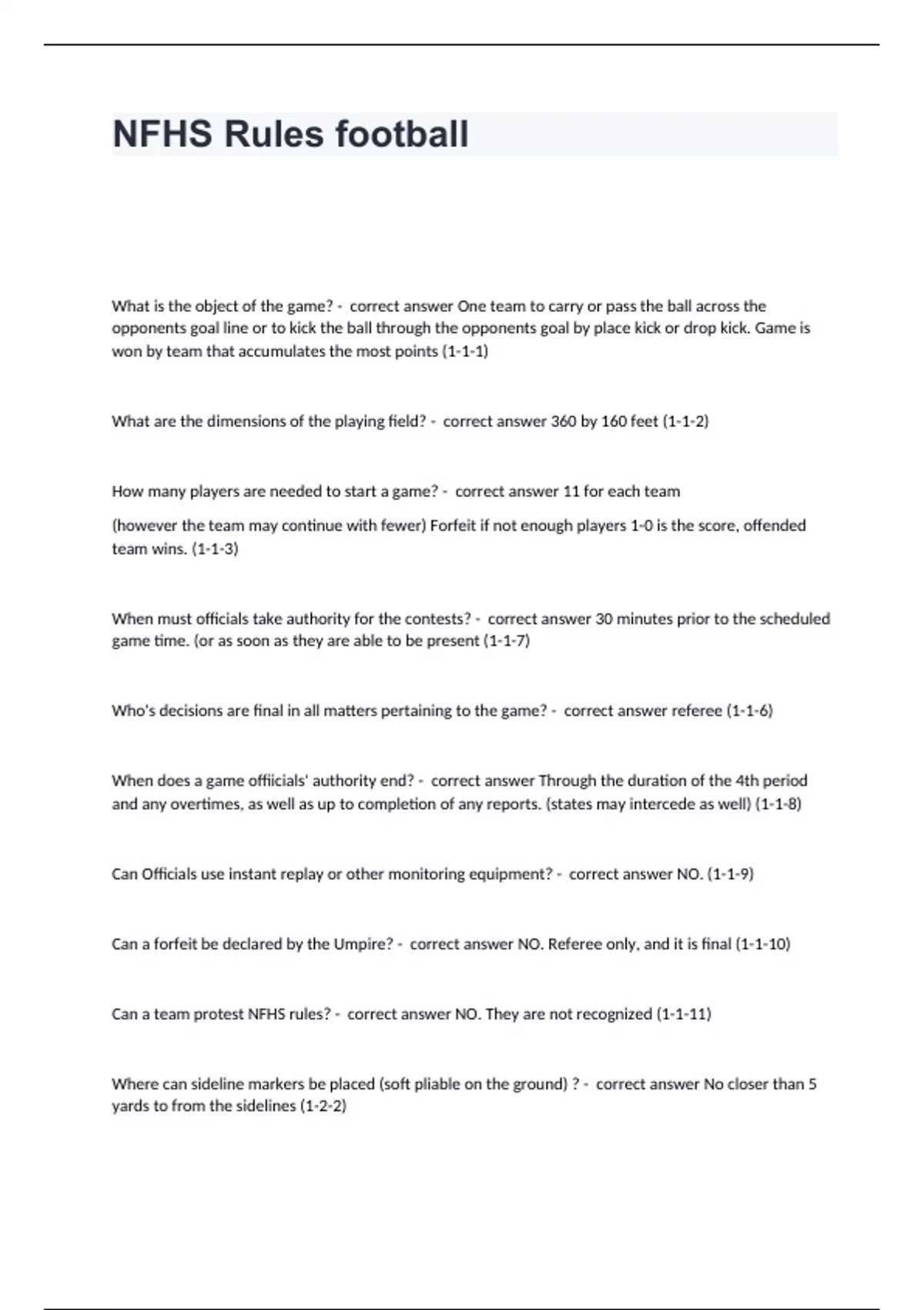 What is the object of the game? - correct answer One team to carry or pass the ball across the opponents goal line or to kick the ball through the opponents goal by place kick or drop kick. Game is won by team that accumulates the most points (1-1-1) What are the dimensions of the playing field? - correct answer 360 by 160 feet (1-1-2) How many players are needed to start a game? - correct answer 11 for each team (however the team may continue with fewer) Forfeit if not enough players 1-0 is the score, offended team wins. (1-1-3) When must officials take authority for the contests? - correct answer 30 minutes prior to the scheduled game time. (or as soon as they are able to be present (1-1-7) Who's decisions are final in all matters pertaining to the game? - correct answer referee (1-1-6) When does a game offiicials' authority end? - correct answer Through the duration of the 4th period and any overtimes, as well as up to completion of any reports. (states may intercede as well) (1-1-8) Can Officials use instant replay or other monitoring equipment? - correct answer NO. (1-1-9) Can a forfeit be declared by the Umpire? - correct answer NO. Referee only, and it is final (1-1-10) Can a team protest NFHS rules? - correct answer NO. They are not recognized (1-1-11) Where can sideline markers be placed (soft pliable on the ground) ? - correct answer No closer than 5 yards to from the sidelines (1-2-2)