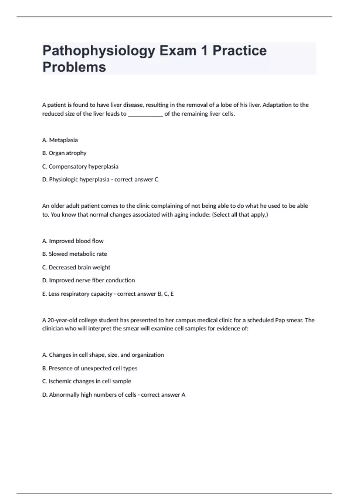 Pathophysiology Exam 1 Practice Problems A patient is found to have liver disease, resulting in the removal of a lobe of his liver. Adaptation to the reduced size of the liver leads to ___________ of the remaining liver cells. A. Metaplasia B. Organ atrophy C. Compensatory hyperplasia D. Physiologic hyperplasia - correct answer C An older adult patient comes to the clinic complaining of not being able to do what he used to be able to. You know that normal changes associated with aging include: (Select all that apply.) A. Improved blood flow B. Slowed metabolic rate C. Decreased brain weight D. Improved nerve fiber conduction E. Less respiratory capacity - correct answer B, C, E A 20-year-old college student has presented to her campus medical clinic for a scheduled Pap smear. The clinician who will interpret the smear will examine cell samples for evidence of: A. Changes in cell shape, size, and organization B. Presence of unexpected cell types C. Ischemic changes in cell sample D. Abnormally high numbers of cells - correct answer A