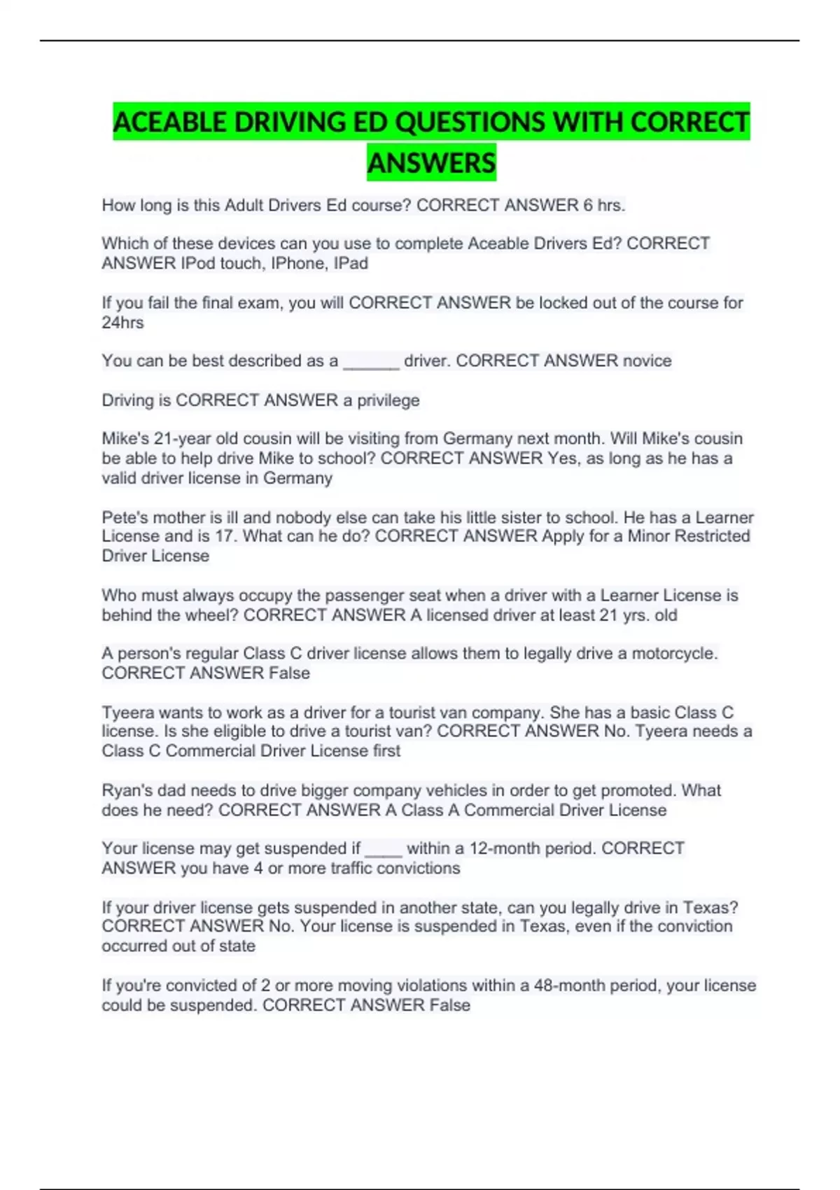 ACEABLE DRIVING ED QUESTIONS WITH CORRECT ANSWERS How long is this Adult Drivers Ed course? CORRECT ANSWER 6 hrs. Which of these devices can you use to complete Aceable Drivers Ed? CORRECT ANSWER IPod touch, IPhone, IPad If you fail the final exam, you will CORRECT ANSWER be locked out of the course for 24hrs You can be best described as a ______ driver. CORRECT ANSWER novice Driving is CORRECT ANSWER a privilege Mike's 21-year old cousin will be visiting from Germany next month. Will Mike's cousin be able to help drive Mike to school? CORRECT ANSWER Yes, as long as he has a valid driver license in Germany Pete's mother is ill and nobody else can take his little sister to school. He has a Learner License and is 17. What can he do? CORRECT ANSWER Apply for a Minor Restricted Driver License Who must always occupy the passenger seat when a driver with a Learner License is behind the wheel? CORRECT ANSWER A licensed driver at least 21 yrs. old A person's regular Class C driver license allows them to legally drive a motorcycle. CORRECT ANSWER False Tyeera wants to work as a driver for a tourist van company. She has a basic Class C license. Is she eligible to drive a tourist van? CORRECT ANSWER No. Tyeera needs a Class C Commercial Driver License first Ryan's dad needs to drive bigger company vehicles in order to get promoted. What does he need? CORRECT ANSWER A Class A Commercial Driver License Your license may get suspended if ____ within a 12-month period. CORRECT ANSWER you have 4 or more traffic convictions If your driver license gets suspended in another state, can you legally drive in Texas? CORRECT ANSWER No. Your license is suspended in Texas, even if the conviction occurred out of state If you're convicted of 2 or more moving violations within a 48-month period, your license could be suspended. CORRECT ANSWER False Points and convictions stay on your driving record for a minimum of: CORRECT ANSWER 3 yrs. You can avoid getting points for a traffic violation by: CORRECT ANSWER Taking defensive driving Why is it important to have your vehicle inspected? CORRECT ANSWER To make sure your car is environmentally friendly It's required by the state To make sure your car is safe