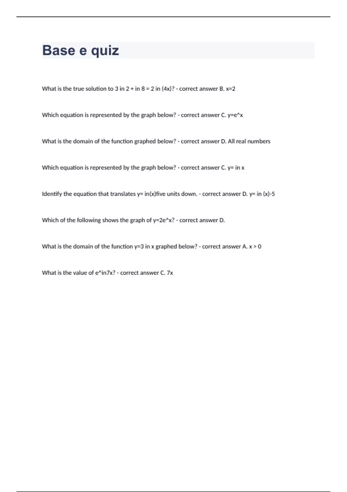 Base Exam Questions Correctly Answered 2024. What is the true solution to 3 in 2 + in 8 = 2 in (4x)? - correct answer B. x=2 Which equation is represented by the graph below? - correct answer C. y=e^x What is the domain of the function graphed below? - correct answer D. All real numbers