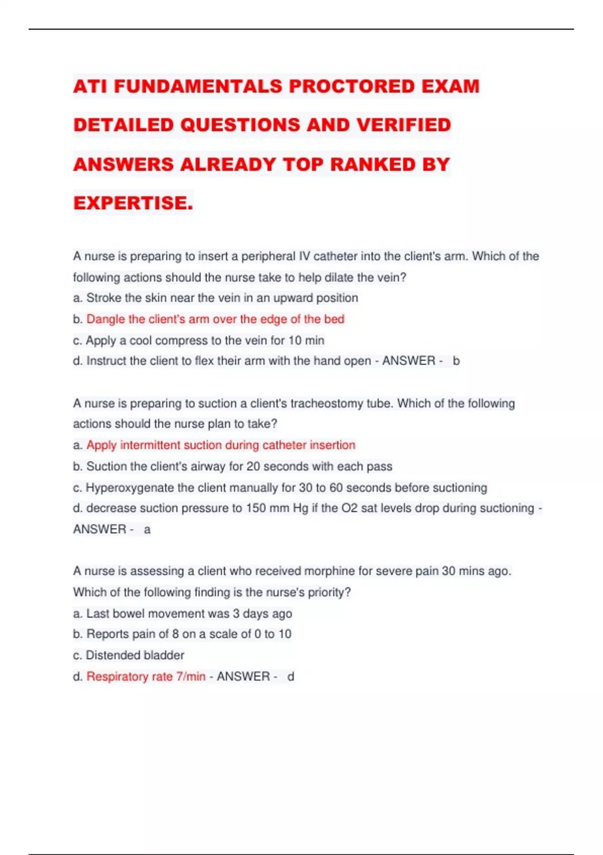 ATI FUNDAMENTALS PROCTORED EXAM DETAILED QUESTIONS AND VERIFIED ANSWERS ALREADY TOP RANKED BY EXPERTISE. A nurse is preparing to insert a peripheral IV catheter into the client's arm. Which of the following actions should the nurse take to help dilate the vein? a. Stroke the skin near the vein in an upward position b. Dangle the client's arm over the edge of the bed c. Apply a cool compress to the vein for 10 min d. Instruct the client to flex their arm with the hand open - ANSWER - b A nurse is preparing to suction a client's tracheostomy tube. Which of the following actions should the nurse plan to take? a. Apply intermittent suction during catheter insertion b. Suction the client's airway for 20 seconds with each pass c. Hyperoxygenate the client manually for 30 to 60 seconds before suctioning d. decrease suction pressure to 150 mm Hg if the O2 sat levels drop during suctioning - ANSWER - a A nurse is assessing a client who received morphine for severe pain 30 mins ago. Which of the following finding is the nurse's priority? a. Last bowel movement was 3 days ago b. Reports pain of 8 on a scale of 0 to 10 c. Distended bladder d. Respiratory rate 7/min - ANSWER - d