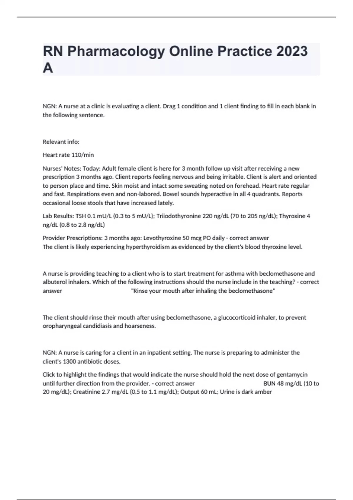 NGN: A nurse at a clinic is evaluating a client. Drag 1 condition and 1 client finding to fill in each blank in the following sentence. Relevant info: Heart rate 110/min Nurses' Notes: Today: Adult female client is here for 3 month follow up visit after receiving a new prescription 3 months ago. Client reports feeling nervous and being irritable. Client is alert and oriented to person place and time. Skin moist and intact some sweating noted on forehead. Heart rate regular and fast. Respirations even and non-labored. Bowel sounds hyperactive in all 4 quadrants. Reports occasional loose stools that have increased lately. Lab Results: TSH 0.1 mU/L (0.3 to 5 mU/L); Triiodothyronine 220 ng/dL (70 to 205 ng/dL); Thyroxine 4 ng/dL (0.8 to 2.8 ng/dL) Provider Prescriptions: 3 months ago: Levothyroxine 50 mcg PO daily - correct answer The client is likely experiencing hyperthyroidism as evidenced by the client's blood thyroxine level. A nurse is providing teaching to a client who is to start treatment for asthma with beclomethasone and albuterol inhalers. Which of the following instructions should the nurse include in the teaching? - correct answer "Rinse your mouth after inhaling the beclomethasone" The client should rinse their mouth after using beclomethasone, a glucocorticoid inhaler, to prevent oropharyngeal candidiasis and hoarseness. NGN: A nurse is caring for a client in an inpatient setting. The nurse is preparing to administer the client's 1300 antibiotic doses. Click to highlight the findings that would indicate the nurse should hold the next dose of gentamycin until further direction from the provider. - correct answer BUN 48 mg/dL (10 to 20 mg/dL); Creatinine 2.7 mg/dL (0.5 to 1.1 mg/dL); Output 60 mL; Urine is dark amber When recognizing cues, the nurse should review the client's EMR, the nurse should recognize the client's elevated BUN, elevated creatinine level, urine output of less than 30mL/hr, and dark amber colored urine are manifestations of nephrotoxicity which is an adverse effect gentamycin and other aminoglycosides. Therefore, the nurse should hold the dose until further directions from the provider. A nurse is preparing to administer heparin subcutaneously to a client. Which of the following actions should the nurse plan to take? - correct answer Administer the medication outside the 5cm (2in) radius of the umbilicus The nurse should admi. the heparin by subQ injection to the abdomen in an area that is above the iliac crest and at least 5 cm (2 in) away fro the umbilicus. NGN: A nurse on a mental health unit is caring for a client. Select the 4 actions the nurse should take. Fluphenazine 2.5 mg PO four times daily LPN entered client's room to administer medication and noted that client did not respond to verbal or tactile stimulation, was diaphoretic, and hot to palpation. Notified RN. Vital signs obtained. Client noted to be incontinent of urine. Client mumbles in response to painful stimuli, muscle rigidity noted. Provider notified. Temperature 40° C (104° F)Heart rate 122/min; Blood pressure 168/112 mm Hg; Respiratory rate 22/min; SpO2 94% on room air - correct answer When taking actions, the nurse should administer dantrolene and bromocriptine, apply a cooling blanket, and discontinue the fluphenazine. The client is exhibiting manifestations of neuroleptic malignant syndrome (NMS), a potentially fatal adverse effect of antipsychotic medications, such as fluphenazine. Other manifestations can include electrolyte imbalance, delirium, and dysrhythmias. Dantrolene and bromocriptine can relieve muscle rigidity and decrease body temperature. Cooling blankets can also assist in decreasing body temperature. The fluphenazine should be discontinued and the client should be transferred to a critical care unit for ongoing treatment. A nurse is caring for a 20 year old female client who has a prescription for isotretinoin for severe nodulocystic acne vulgarism. Before the client can obtain a refill, the nurse should advise the client that which of the following tests is required? - correct answer Pregnancy Test The nurse should instruct the client that isotretinoin has teratogenic effects; therefore, pregnancy must be ruled out before the client can obtain a refill. the client must provide two negative pregnancy tests for the initial prescription and one negative test before monthly refills. A nurse is instructing a client on the application of nitroglycerin transdermal patches. Which of the following statements by the client indicates an understating of the teaching? - correct answer "I will take the patch off right after my evening meal" Clients should remove the patch each evening for a medication free time of 12 to 14 hours before applying a new patch to avoid developing a tolerance to the medication's effects. a nurse is reviewing the medication list of a client who wants to begin taking oral contraceptives. The nurse should identify that which of the following client medications will interfere with the effectiveness of oral contraceptives? - correct answer Carbamazepine carbamazepine causes an accelerated inactivation of oral contraceptives because of its action on hepatic medication-metabolizing enzymes. A nurse is monitoring for adverse effects of hydrochlorothiazide after administering the medication to an older adult client who has heart failure. Which of the following findings should the nurse identify as an adverse effect of the medication?