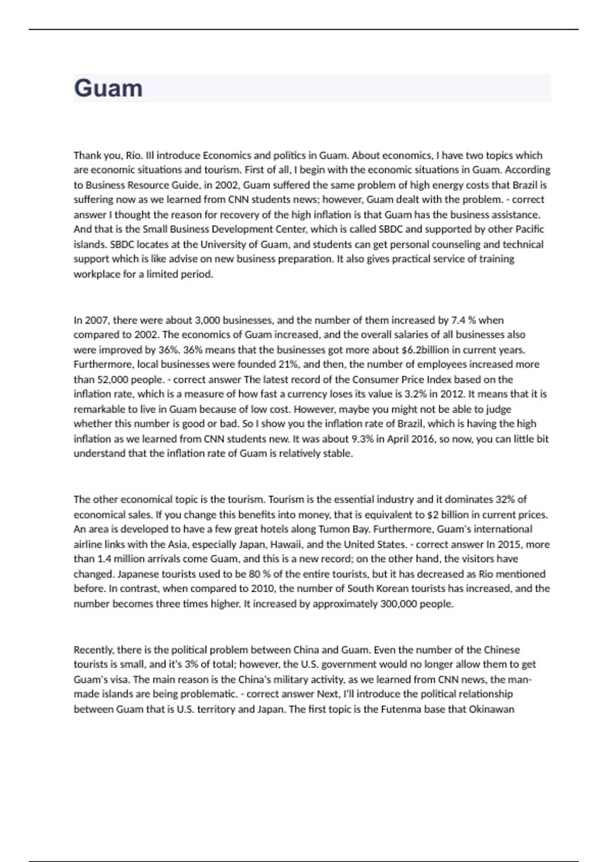 Guam Written Exam Questions 2024. Thank you, Rio. IIl introduce Economics and politics in Guam. About economics, I have two topics which are economic situations and tourism. First of all, I begin with the economic situations in Guam. According to Business Resource Guide, in 2002, Guam suffered the same problem of high energy costs that Brazil is suffering now as we learned from CNN students news; however, Guam dealt with the problem. - correct answer I thought the reason for recovery of the high inflation is that Guam has the business assistance. And that is the Small Business Development Center, which is called SBDC and supported by other Pacific islands. SBDC locates at the University of Guam, and students can get personal counseling and technical support which is like advise on new business preparation. It also gives practical service of training workplace for a limited period. In 2007, there were about 3,000 businesses, and the number of them increased by 7.4 % when compared to 2002. The economics of Guam increased, and the overall salaries of all businesses also were improved by 36%. 36% means that the businesses got more about $6.2billion in current years. Furthermore, local businesses were founded 21%, and then, the number of employees increased more than 52,000 people. - correct answer The latest record of the Consumer Price Index based on the inflation rate, which is a measure of how fast a currency loses its value is 3.2% in 2012. It means that it is remarkable to live in Guam because of low cost. However, maybe you might not be able to judge whether this number is good or bad. So I show you the inflation rate of Brazil, which is having the high inflation as we learned from CNN students new. It was about 9.3% in April 2016, so now, you can little bit understand that the inflation rate of Guam is relatively stable.