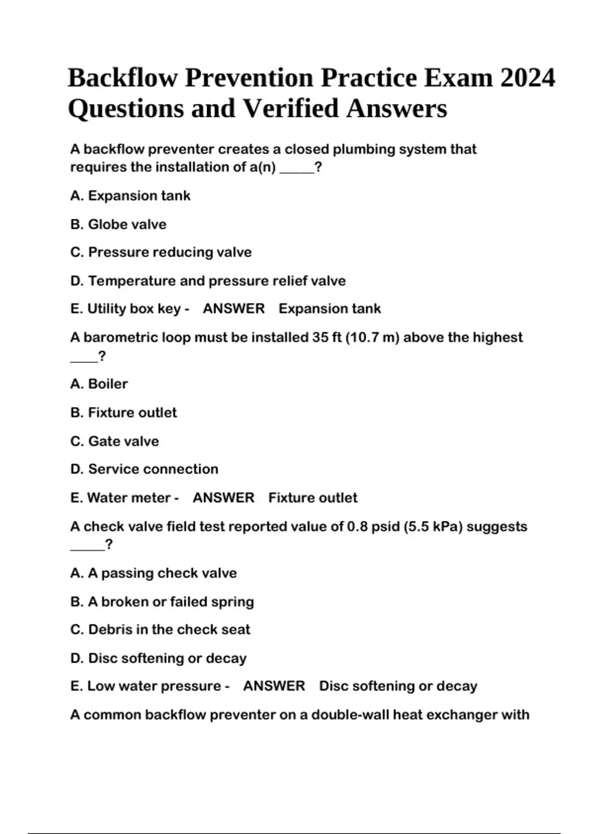 Backflow Prevention Practice Exam 2024 Questions and Verified Answers. A backflow preventer creates a closed plumbing system that requires the installation of a(n) _____? A. Expansion tank B. Globe valve C. Pressure reducing valve D. Temperature and pressure relief valve E. Utility box key - ANSWER Expansion tank A barometric loop must be installed 35 ft (10.7 m) above the highest ____? A. Boiler B. Fixture outlet C. Gate valve D. Service connection E. Water meter - ANSWER Fixture outlet A check valve field test reported value of 0.8 psid (5.5 kPa) suggests _____? A. A passing check valve B. A broken or failed spring C. Debris in the check seat D. Disc softening or decay E. Low water pressure - ANSWER Disc softening or decay A common backflow preventer on a double-wall heat exchanger with Backflow Prevention Practice Exam 2024 Questions and Verified Answers leak detection is ____? A. An air-gap separation B. An atmospheric vacuum breaker C. A double check valve assembly D. A reduced pressure principle assembly E. Nothing - ANSWER Nothing A cross-connection may be a permanent piping arrangement or a(n) ____? A. Backflow preventer B. Church symbol C. OSHA hazardous area designation D. Railroad and highway intersection sign E. Temporary hose bibb connection - ANSWER Temporary hose bibb connection A deck-mounted atmospheric vacuum breaker's critical installation level is above the outlet usage by ___? A. 1 in. (2.5 cm) B. 3 in. (7.6 cm) C. 6 in. (15 cm) D. 12 in. (30 cm) E. 18 in. (46 cm) - ANSWER 1 in. (2.5 cm) A differential pressure gauge reading of 0.2 psid is represented on water column sight tube by _____? A. 1/16 in. (0.16 cm) B. 1/2 in. (1.3 cm) C. 2 in. (5.1 cm) D. 3.5 in. (8.9 cm) E. 5.5 in. (14 cm) - ANSWER 5.5 in. (14 cm) A direct cross-connection suggests the piping system may be subjected to ____? A. Backpressure or backsiphonage B. Backsiphonage only C. Periodic inspection D. Sustained pressure E. Toxic materials - ANSWER Backpressure or backsiphonage A double check valve assembly installed in a vertical flow down orientation is only allowed ______? A. In a basement or vault B. If the assembly was tested and approved as such C. If the check weight does not compress the spring D. On fire-suppression systems E. On water supply service connections - ANSWER If the assembly was tested and approved as such A double check valve assembly is installed 12 in. (30.5 cm) above the floor for _____? A. Electrical code compliance B. Floor draining C. Maintenance D. Mechanical code compliance E. Rodent control - ANSWER Maintenance A field test report for a double check valve assembly will include the manufacturer's name, model, size, and _____? A. Body material B. Date of manufacture C. Serial number D. Working pressure (maximum) E. Working temperature (maximum) - ANSWER Serial number A fire sprinkler system's backflow protection for a black-iron pipe system is typically ____? A. An air-gap separation B. A double check valve assembly C. A reduced pressure principle assembly D. A reduced pressure detector assembly E. No protection required - ANSWER A double check valve assembly.