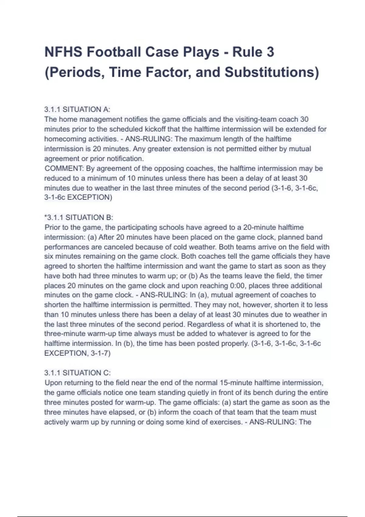 NFHS Football Case Plays - Rule 3 (Periods, Time Factor, and Substitutions)