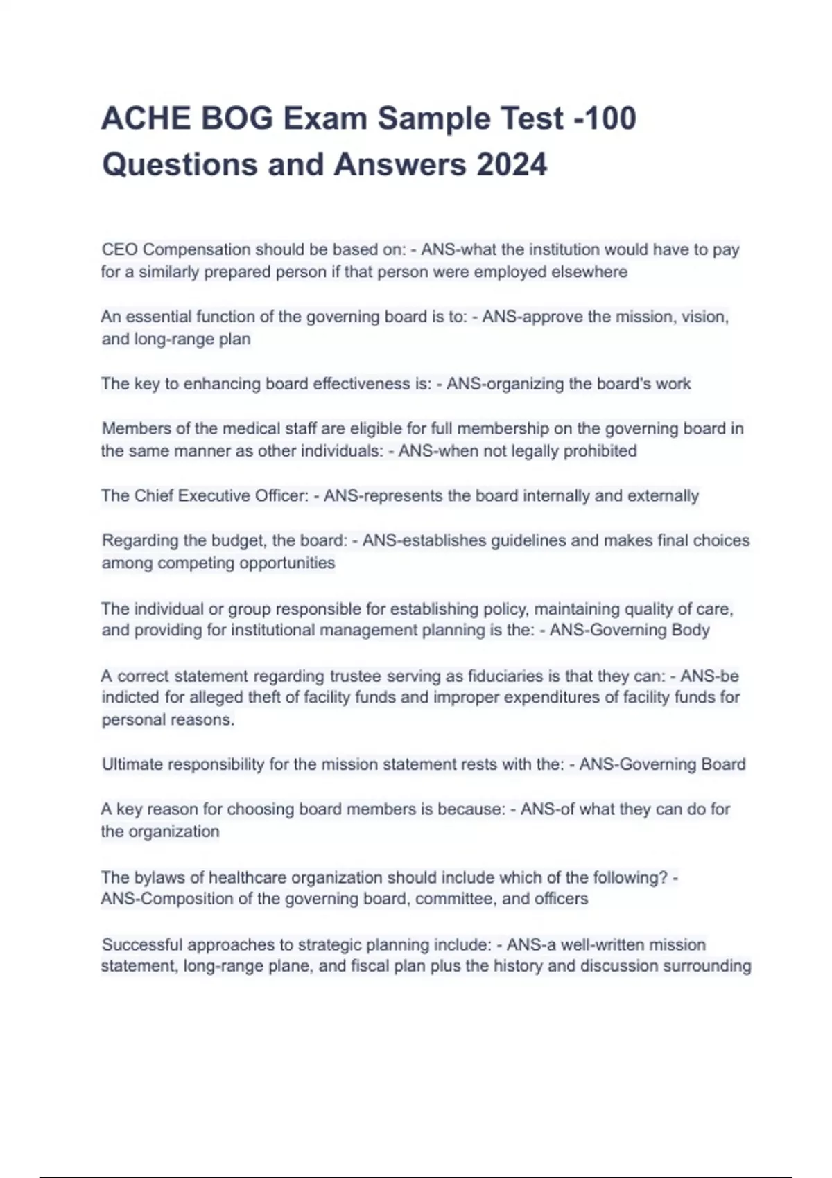 ACHE BOG Exam Sample Test -100 Questions and Answers 2024