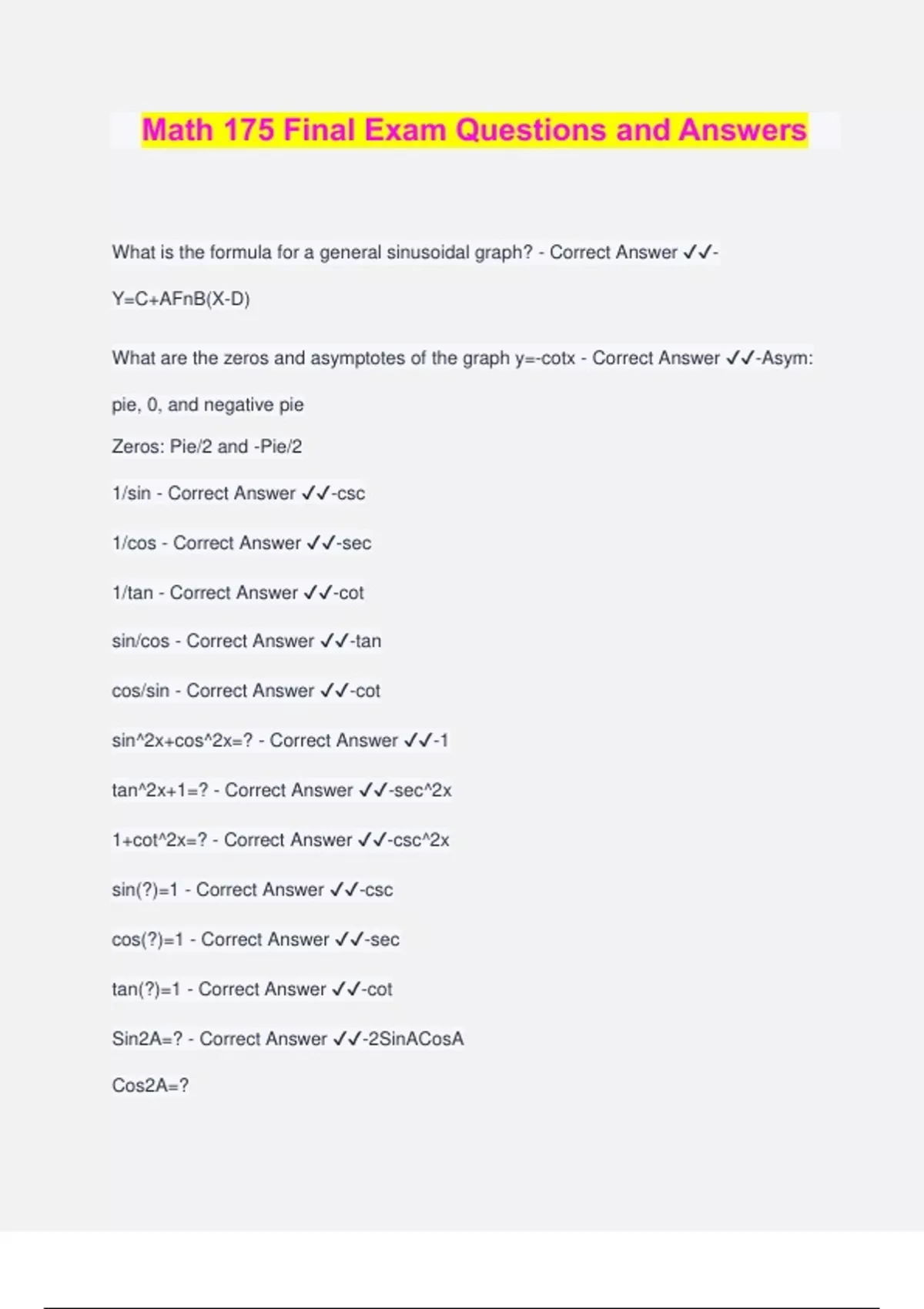 Math 175 Final Exam Questions and Answers What is the formula for a general sinusoidal graph? - Correct Answer ️️ - Y=C+AFnB(X-D) What are the zeros and asymptotes of the graph y=-cotx - Correct Answer ️️ -Asym: pie, 0, and negative pie Zeros: Pie/2 and -Pie/2 1/sin - Correct Answer ️️ -csc 1/cos - Correct Answer ️️ -sec 1/tan - Correct Answer ️️ -cot sin/cos - Correct Answer ️️ -tan cos/sin - Correct Answer ️️ -cot sin^2x+cos^2x=? - Correct Answer ️️ -1 tan^2x+1=? - Correct Answer ️️ -sec^2x 1+cot^2x=? - Correct Answer ️️ -csc^2x sin(?)=1 - Correct Answer ️️ -csc cos(?)=1 - Correct Answer ️️ -sec tan(?)=1 - Correct Answer ️️ -cot Sin2A=? - Correct Answer ️️ -2SinACosA Cos2A=?