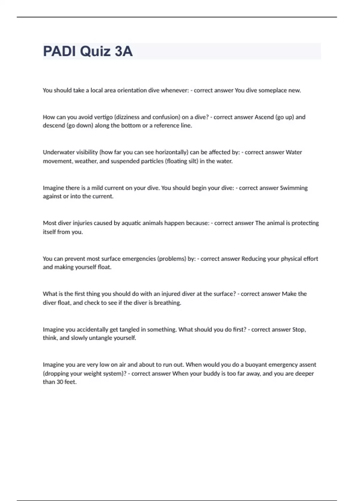 How can you avoid vertigo (dizziness and confusion) on a dive? - correct answer Ascend (go up) and descend (go down) along the bottom or a reference line.