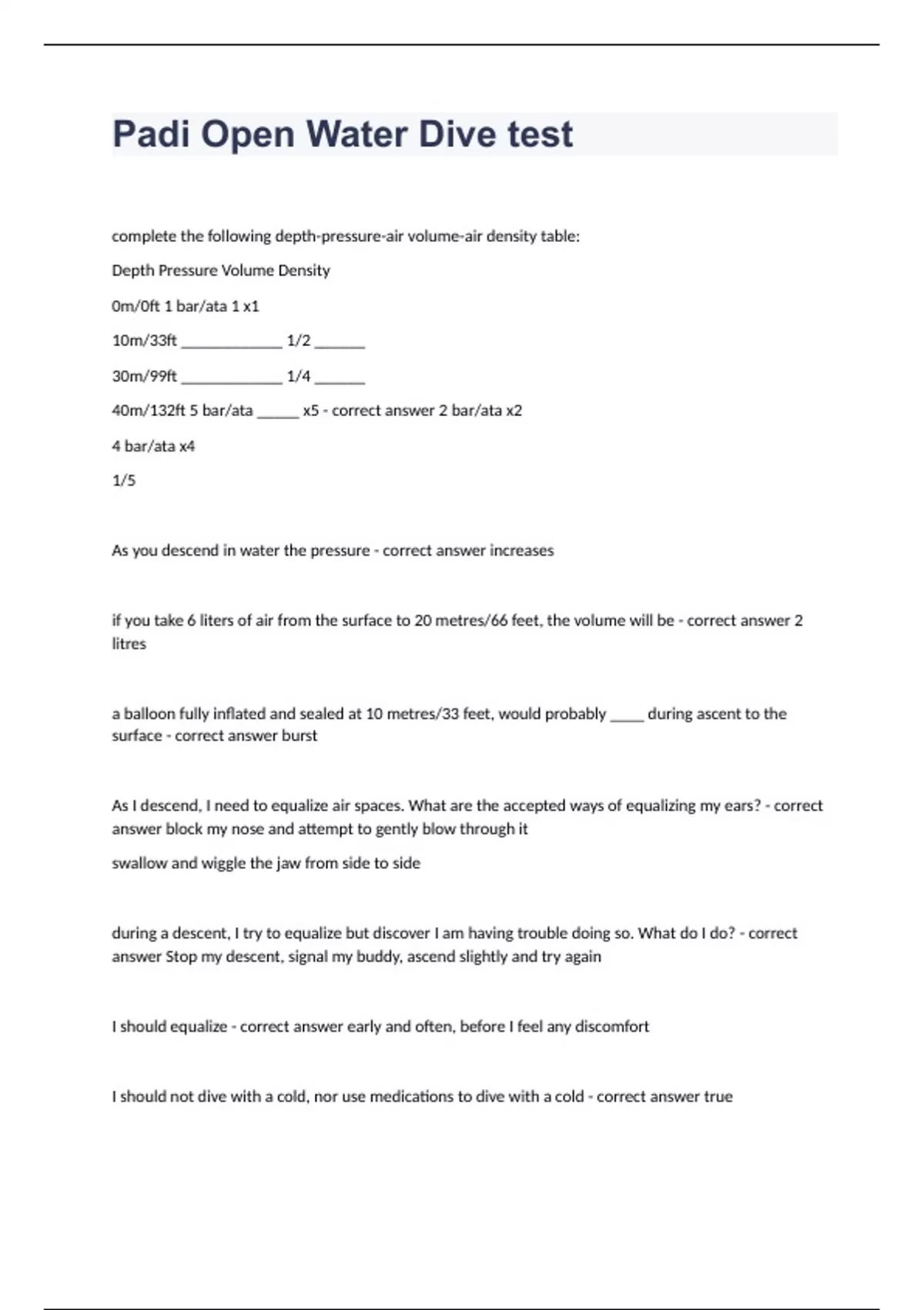 PADI Open Water Dive Test Correctly Answered 2024. complete the following depth-pressure-air volume-air density table: Depth Pressure Volume Density 0m/0ft 1 bar/ata 1 x1 10m/33ft ____________ 1/2 ______ 30m/99ft ____________ 1/4 ______ 40m/132ft 5 bar/ata _____ x5 - correct answer 2 bar/ata x2 4 bar/ata x4 1/5 As you descend in water the pressure - correct answer increases if you take 6 liters of air from the surface to 20 metres/66 feet, the volume will be - correct answer 2 litres a balloon fully inflated and sealed at 10 metres/33 feet, would probably ____ during ascent to the surface - correct answer burst As I descend, I need to equalize air spaces. What are the accepted ways of equalizing my ears? - correct answer block my nose and attempt to gently blow through it swallow and wiggle the jaw from side to side during a descent, I try to equalize but discover I am having trouble doing so. What do I do? - correct answer Stop my descent, signal my buddy, ascend slightly and try again I should equalize - correct answer early and often, before I feel any discomfort I should not dive with a cold, nor use medications to dive with a cold - correct answer true