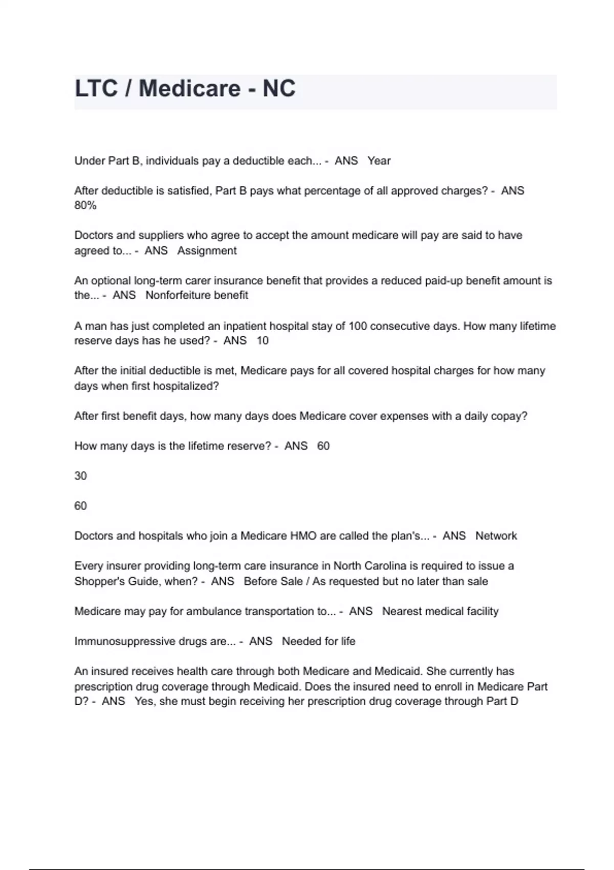LTC / Medicare - NC Exam Questions And Answers Under Part B, individuals pay a deductible each... - ANS Year After deductible is satisfied, Part B pays what percentage of all approved charges? - ANS 80% Doctors and suppliers who agree to accept the amount medicare will pay are said to have agreed to... - ANS Assignment An optional long-term carer insurance benefit that provides a reduced paid-up benefit amount is the... - ANS Nonforfeiture benefit A man has just completed an inpatient hospital stay of 100 consecutive days. How many lifetime reserve days has he used? - ANS 10 After the initial deductible is met, Medicare pays for all covered hospital charges for how many days when first hospitalized? After first benefit days, how many days does Medicare cover expenses with a daily copay? How many days is the lifetime reserve? - ANS 60 30 60 Doctors and hospitals who join a Medicare HMO are called the plan's... - ANS Network Every insurer providing long-term care insurance in North Carolina is required to issue a Shopper's Guide, when? - ANS Before Sale / As requested but no later than sale Medicare may pay for ambulance transportation to... - ANS Nearest medical facility Immunosuppressive drugs are... - ANS Needed for life An insured receives health care through both Medicare and Medicaid. She currently has prescription drug coverage through Medicaid. Does the insured need to enroll in Medicare Part D? - ANS Yes, she must begin receiving her prescription drug coverage through Part D