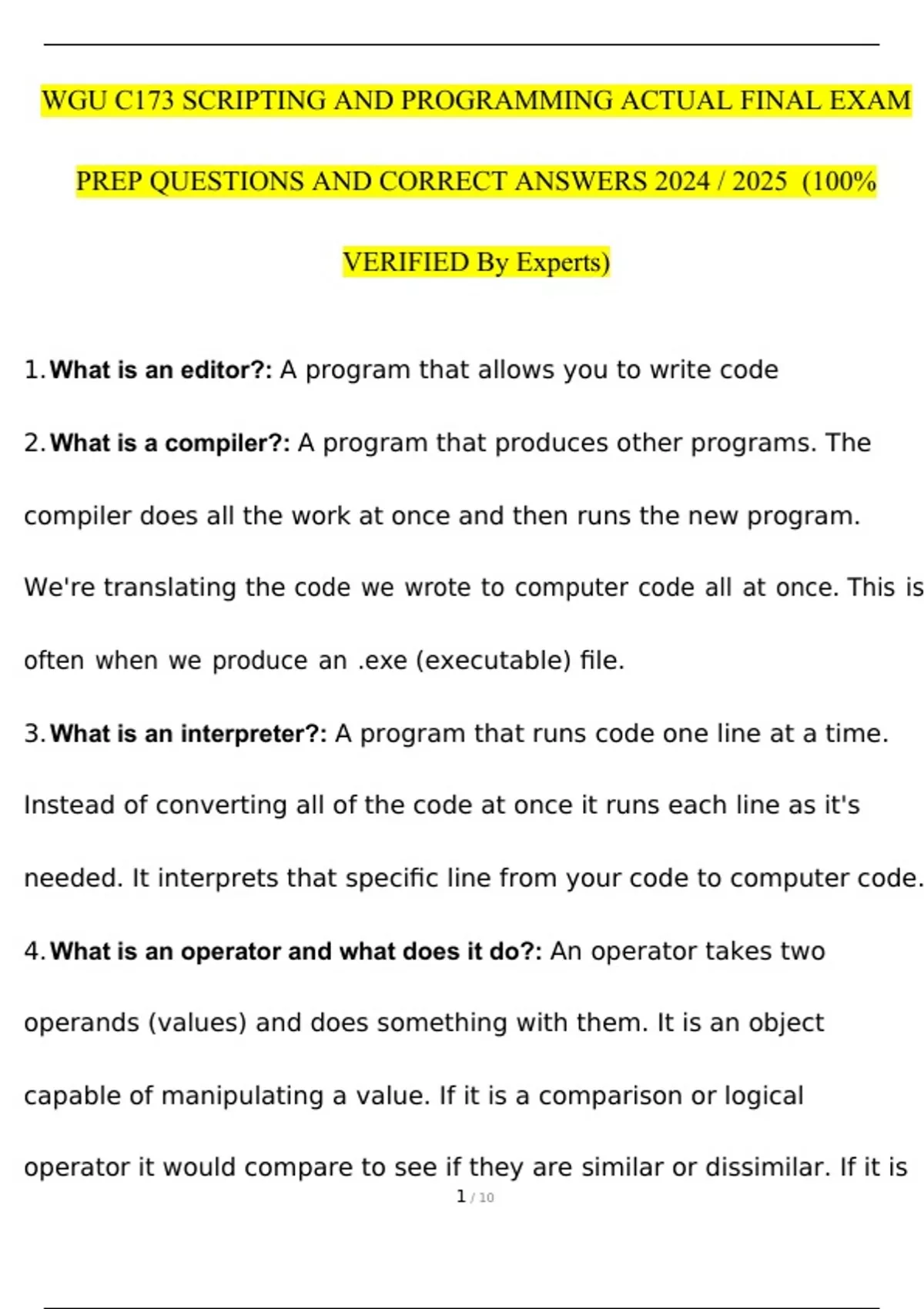 WGU C173 SCRIPTING AND PROGRAMMING ACTUAL FINAL EXAM PREP QUESTIONS AND ANSWERS 2024 / 2025 | 100% VERIFIED ANSWERS