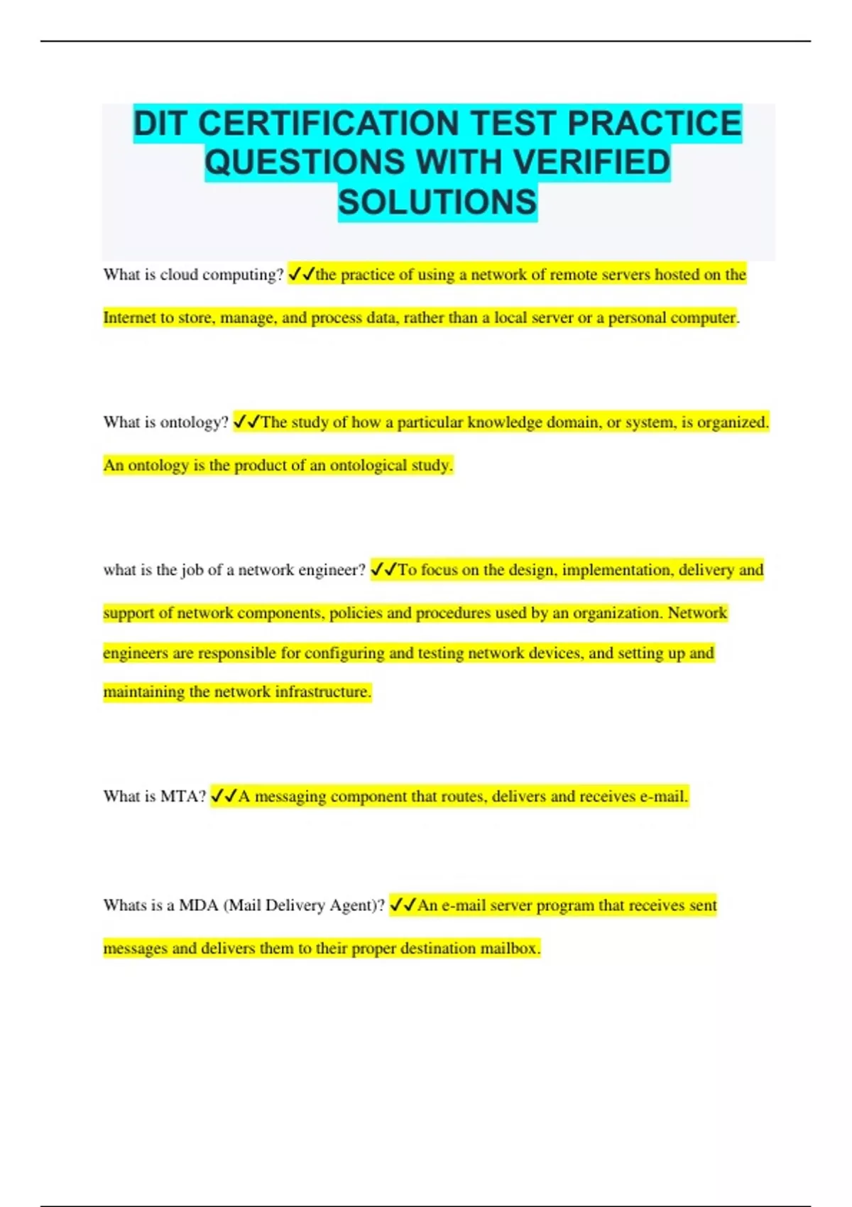 DIT CERTIFICATION TEST PRACTICE QUESTIONS WITH VERIFIED SOLUTIONS What is cloud computing? the practice of using a network of remote servers hosted on the Internet to store, manage, and process data, rather than a local server or a personal computer. What is ontology? The study of how a particular knowledge domain, or system, is organized. An ontology is the product of an ontological study. what is the job of a network engineer? To focus on the design, implementation, delivery and support of network components, policies and procedures used by an organization. Network engineers are responsible for configuring and testing network devices, and setting up and maintaining the network infrastructure. What is MTA? A messaging component that routes, delivers and receives e-mail. Whats is a MDA (Mail Delivery Agent)? An e-mail server program that receives sent messages and delivers them to their proper destination mailbox. What does POP3 servers do? POP3 servers receive and hold incoming e-mail messages in the appropriate mailbox on the server until users log on (authenticate themselves with a user name and password) and download their mail. Once messages are downloaded, they are removed from the server what do IMAP servers do? IMAP server receives and holds your messages. When you log on with your user name and password, you can read a message on the server, or you can view just the heading and the sender of the message and decide whether to download it. what is a mail client also refered to as? MAIL USER AGENT Because file attachments may contain malicious code that can be used to damage or infiltrate systems, your company routinely scans all file attachments in incoming e-mail. Where does attachment scanning take place? At the server, usually just after the message has been received via SMTP A domain name consists of letters (and sometimes numbers) separated by periods. Which of the following is the host name component of a domain name? The left-side component of the domain name, which categorizes domains into groups by server name Which of the following is a Web-based seminar or training session that is typically interactive, enabling participants to communicate with the presenter and with each other via online chat? Web conference Kim is using the YouTube graphics-editing application that she accesses via the Internet through her browser. Kim does not own the application, nor can she download it. She is able to use the application any time she needs to edit graphics. Although she does not have to pay for the access, she does notice advertisements, which appear on the sidebar of the application's interface. The application Kim is using may be classified as which of the following? Software as a Service (SaaS) Cloud computing is a computing paradigm in which? users are able to access software and services run by servers that reside on the Internet. Cloud computing is software services that are provided over the Internet. Which of the following IT job roles should be most familiar with cloud computing software, infrastructure and platform services? Server administrator What is restricted from downloading to the user's system when you configure browser security levels? active content Which of the following is true regarding smartphones and PIM applications? Smartphone PIM applications are designed to work in tandem with traditional desktop or laptop computers. What could be a disadvantage for you to choose open-source, and thus a compelling enough reason to purchase the licensed software instead of using the open-source solution? Maintenance of an open-source solution relies