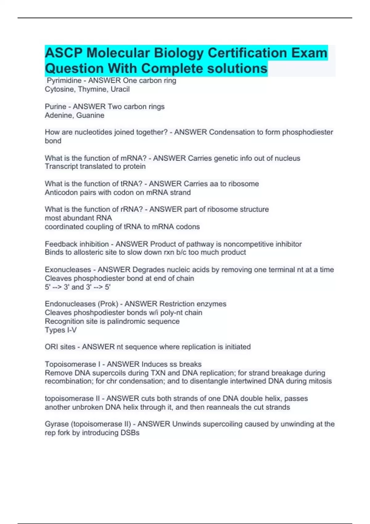 ASCP Molecular Biology Certification Exam Question With Complete solutions Pyrimidine - ANSWER One carbon ring Cytosine, Thymine, Uracil Purine - ANSWER Two carbon rings Adenine, Guanine How are nucleotides joined together? - ANSWER Condensation to form phosphodiester bond What is the function of mRNA? - ANSWER Carries genetic info out of nucleus Transcript translated to protein What is the function of tRNA? - ANSWER Carries aa to ribosome Anticodon pairs with codon on mRNA strand What is the function of rRNA? - ANSWER part of ribosome structure most abundant RNA coordinated coupling of tRNA to mRNA codons Feedback inhibition - ANSWER Product of pathway is noncompetitive inhibitor Binds to allosteric site to slow down rxn b/c too much product Exonucleases - ANSWER Degrades nucleic acids by removing one terminal nt at a time Cleaves phosphodiester bond at end of chain 5' --> 3' and 3' --> 5' Endonucleases (Prok) - ANSWER Restriction enzymes Cleaves phoshpodiester bonds w/i poly-nt chain Recognition site is palindromic sequence Types I-V ORI sites - ANSWER nt sequence where replication is initiated Topoisomerase I - ANSWER Induces ss breaks Remove DNA supercoils during TXN and DNA replication; for strand breakage during recombination; for chr condensation; and to disentangle intertwined DNA during mitosis topoisomerase II - ANSWER cuts both strands of one DNA double helix, passes another unbroken DNA helix through it, and then reanneals the cut strands Gyrase (topoisomerase II) - ANSWER Unwinds supercoiling caused by unwinding at the rep fork by introducing DSBs Helicase - ANSWER Breaks H-bonds of double helix at the replication fork Primase - ANSWER DNApol α (DNA dep RNA pol) adds short segments of complementary RNA to ssDNA template (primers), serves as starting points for replication single-strand DNA binding proteins (SSBPs) - ANSWER Binds ssDNA and prevents it from re-annealing during TXN, replication, repair, and recombination Okazaki fragments - ANSWER Short fragments of DNA synthesized by DNApol δ using the lagging strand (3'->5') as a template Ligase - ANSWER Closes gaps in DNA Catalyzes phosphodiester bond between 3'OH and 5'P What are the steps in DNA replication? - ANSWER 1. Initiate 2. Elongate 3. Terminate Telomeres - ANSWER Repeat sequence (TTAGGG) at the ends of chr, protect chr from degradation RNA polymerase - ANSWER DNA dependent RNApol Transcribes DNA template to RNA (3'-->5'; anti-parallel) Splicesomes - ANSWER Complex of snRNPs Removes introns from pre-mRNA and splices exons together Enhancers - ANSWER Short regions of DNA that bind proteins (TXN factors) that enhance TXN of a gene Poly-A tail - ANSWER Prevents mRNA from being degraded in cytoplasm 100-250 A's at 3' end 5' cap - ANSWER 5'-5' pyrophosphate bridge to a methylated G added to 5' end of a mRNA Protects against degradation and as a recognition signal for TLN apparatus aminoacyl tRNA - ANSWER tRNAs that carry amino acids Ribosomes - ANSWER Where TLN occurs Prok: 30s and 50s Euk: 40s and 60s Catalyzes peptide bond between a.a.'s What is the path of a tRNA in a ribosome? - ANSWER Acceptor > Peptidyl > Exit How is translation initiated? - ANSWER small rRNA (40S) subunit binds mRNA and scans for start codon (AUG) Met-tRNA is brought to the P site Large rRNA (60S) subunit binds How is translation terminated? - ANSWER Occurs when stop codon enters A site Release factor recognizes stop codon, hydrolyzes ester bond with P site, releasing aa chain Reverse transcriptase - ANSWER enzyme that transcribes RNA to cDNA (lacks introns) RNA --> RNA:DNA --> cDNA (dsDNA) Pleiotrophy - ANSWER a single gene controls the expression of many phenotypic traits ie Sickle Cell Anemia
