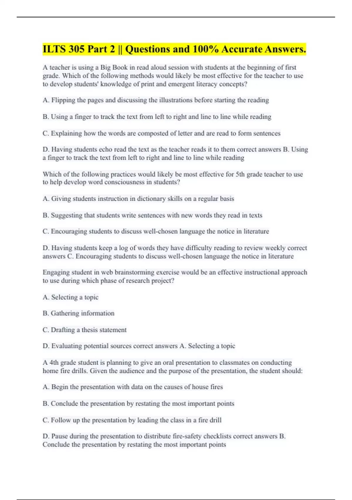 A teacher is using a Big Book in read aloud session with students at the beginning of first grade. Which of the following methods would likely be most effective for the teacher to use to develop students' knowledge of print and emergent literacy concepts? A. Flipping the pages and discussing the illustrations before starting the reading B. Using a finger to track the text from left to right and line to line while reading C. Explaining how the words are composted of letter and are read to form sentences D. Having students echo read the text as the teacher reads it to them correct answers B. Using a finger to track the text from left to right and line to line while reading Which of the following practices would likely be most effective for 5th grade teacher to use to help develop word consciousness in students? A. Giving students instruction in dictionary skills on a regular basis B. Suggesting that students write sentences with new words they read in texts C. Encouraging students to discuss well-chosen language the notice in literature D. Having students keep a log of words they have difficulty reading to review weekly correct answers C. Encouraging students to discuss well-chosen language the notice in literature Engaging student in web brainstorming exercise would be an effective instructional approach to use during which phase of research project? A. Selecting a topic B. Gathering information C. Drafting a thesis statement D. Evaluating potential sources correct answers A. Selecting a topic A 4th grade student is planning to give an oral presentation to classmates on conducting home fire drills. Given the audience and the purpose of the presentation, the student should: A. Begin the presentation with data on the causes of house fires B. Conclude the presentation by restating the most important points C. Follow up the presentation by leading the class in a fire drill D. Pause during the presentation to distribute fire-safety checklists correct answers B. Conclude the presentation by restating the most important points