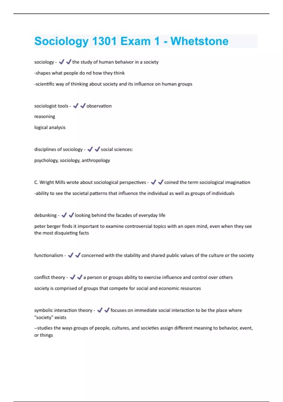 Sociology 1301 Exam 1 - Whetstone questions and answers graded A+