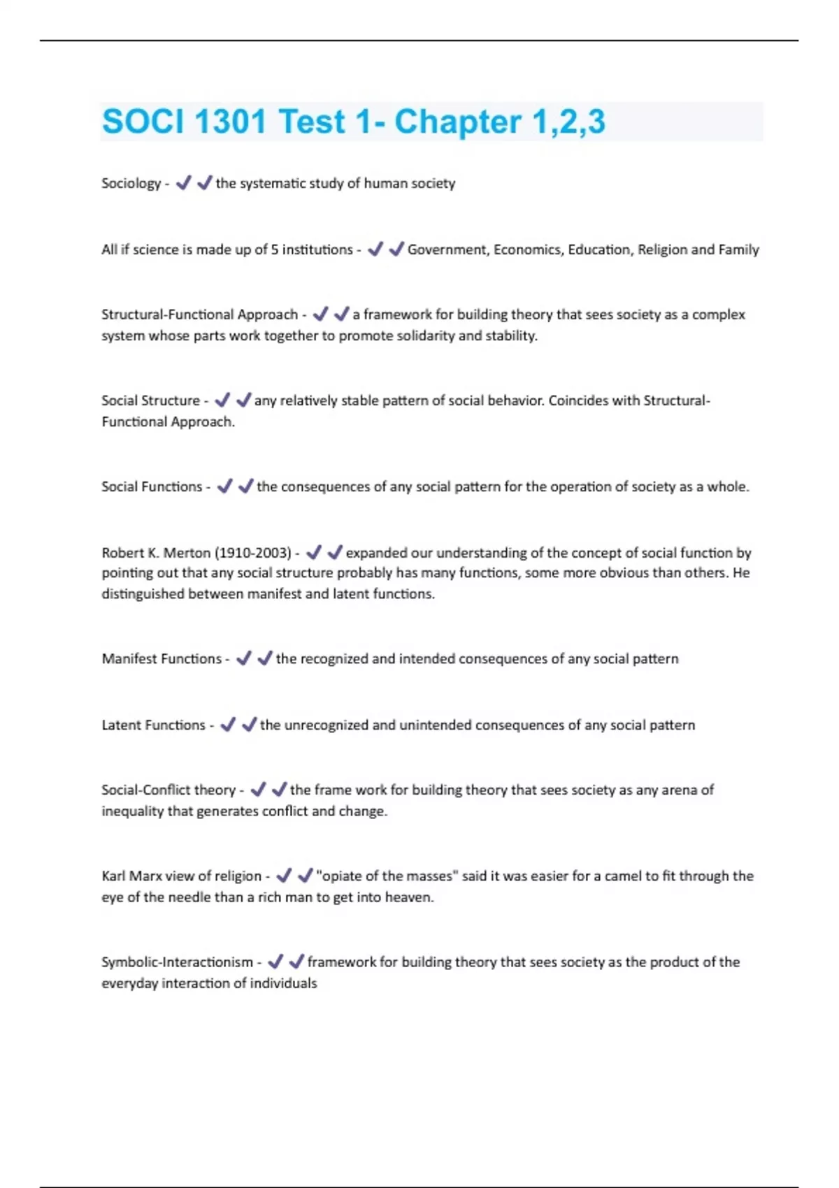 Sociology - the systematic study of human society All if science is made up of 5 institutions - Government, Economics, Education, Religion and Family Structural-Functional Approach - a framework for building theory that sees society as a complex system whose parts work together to promote solidarity and stability. Social Structure - any relatively stable pattern of social behavior. Coincides with StructuralFunctional Approach. Social Functions - the consequences of any social pattern for the operation of society as a whole. Robert K. Merton () - expanded our understanding of the concept of social function by pointing out that any social structure probably has many functions, some more obvious than others. He distinguished between manifest and latent functions. Manifest Functions - the recognized and intended consequences of any social pattern Latent Functions - the unrecognized and unintended consequences of any social pattern Social-Conflict theory - the frame work for building theory that sees society as any arena of inequality that generates conflict and change. Karl Marx view of religion - "opiate of the masses" said it was easier for a camel to fit through the eye of the needle than a rich man to get into heaven. Symbolic-Interactionism - framework for building theory that sees society as the product of the everyday interaction of individualsLooking-glass Self - social psychological concept created by Charles Horton Cooley in 1902. It states that a person's self grows out of society's interpersonal interactions and the perceptions of others C.H Cooley - created the concept of the "looking-glass self" Social marginality - being excluded from social activity as an "outsider" Objectivity - personal neutrality in conduction research Levels of Science (Kung and Deloria) - Micro-science is studying the minute (the virtually invisible). Atomic/Subatomic level. All variable can be controlled and experiments can prove cause-and-effect. Macro-science is examining phenomena on a mass scale (astronomy/astrophysics). From total control of variables to no control. We can only observe and measure from afar/. Meso-Science is human size. Hawthorne Effect - a change in a subject's behavior caused simply by the awareness of being studied Androcentircity - "focus on the male" refers to approaching an issue from a males perspective. Random sample - is when researchers draw a sample from the population at random so every person in the population has an equal chance of being selected; whereas, a sample is a part of a population that represents the whole. Independent Variables - a variable that an experimenter manipulates Dependent Variables - a variable that an experimenter predicts will be affected by manipulations of the independent variableCorrelations - statistical relationship between two variables. Short of cause-and-effect. Cant say A causes B, but can measure a change that takes place in A and B at the same time. Ex: Shark attacks in Florida and ice cream sales in New York City. Positive Correlations - increases in one variable are associated with increases in the other. Negative Correlations - Increases in one variable are associated with decreases in the other.