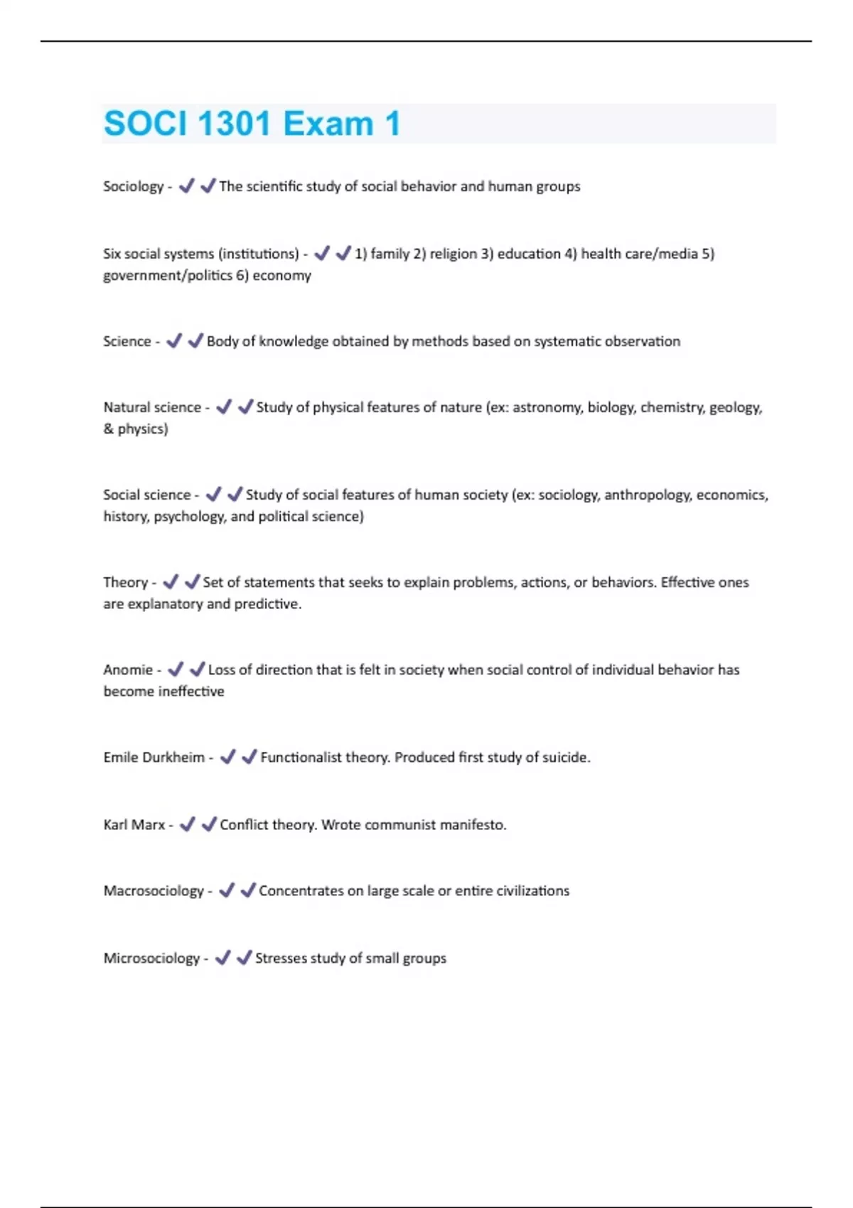 Sociology - The scientific study of social behavior and human groups Six social systems (institutions) - 1) family 2) religion 3) education 4) health care/media 5) government/politics 6) economy Science - Body of knowledge obtained by methods based on systematic observation Natural science - Study of physical features of nature (ex: astronomy, biology, chemistry, geology, & physics) Social science - Study of social features of human society (ex: sociology, anthropology, economics, history, psychology, and political science) Theory - Set of statements that seeks to explain problems, actions, or behaviors. Effective ones are explanatory and predictive. Anomie - Loss of direction that is felt in society when social control of individual behavior has become ineffective Emile Durkheim - Functionalist theory. Produced first study of suicide. Karl Marx - Conflict theory. Wrote communist manifesto. Macrosociology - Concentrates on large scale or entire civilizations Microsociology - Stresses study of small groupsW.E.B Du Bois - An African American view Three theoretical perspectives (lenses) - • functionalist perspective • conflict perspective • interactionist perspective Sociological imagination - An awareness of the relationship between an individual and the wider society (C. Wright Mills) Early thinkers - •Auguste Comte •Harriet Martineau •Herbert Spencer Auguste Comte - Coined term sociology to apply to science of human behavior Social inequality - Condition in which members of society have differing amounts of wealth, prestige, or power Queer theory - Study of society from the perspective of a broad spectrum of sexual identities including, heterosexual, homosexual, and bisexual Feminist perspective - Sees inequity in gender as central to all behavior and organization Dysfunction - Element or process of a society that may actually disrupt the social system or reduce its stability Conflict perspective - Assumes that social behavior is best understood in terms of tension between groups over power or the allocation of resourcesInteractionist perspective - Generalize about everyday forms of social interaction in order to explain society as a whole Functionalist perspective - Emphasizes the way in which parts of a society are structured to maintain its stability Double consciousness - Division of an individual's identity into two or more social realities Applied sociology - Use of the discipline of sociology with intent of yielding practical applications for human behavior and organizations