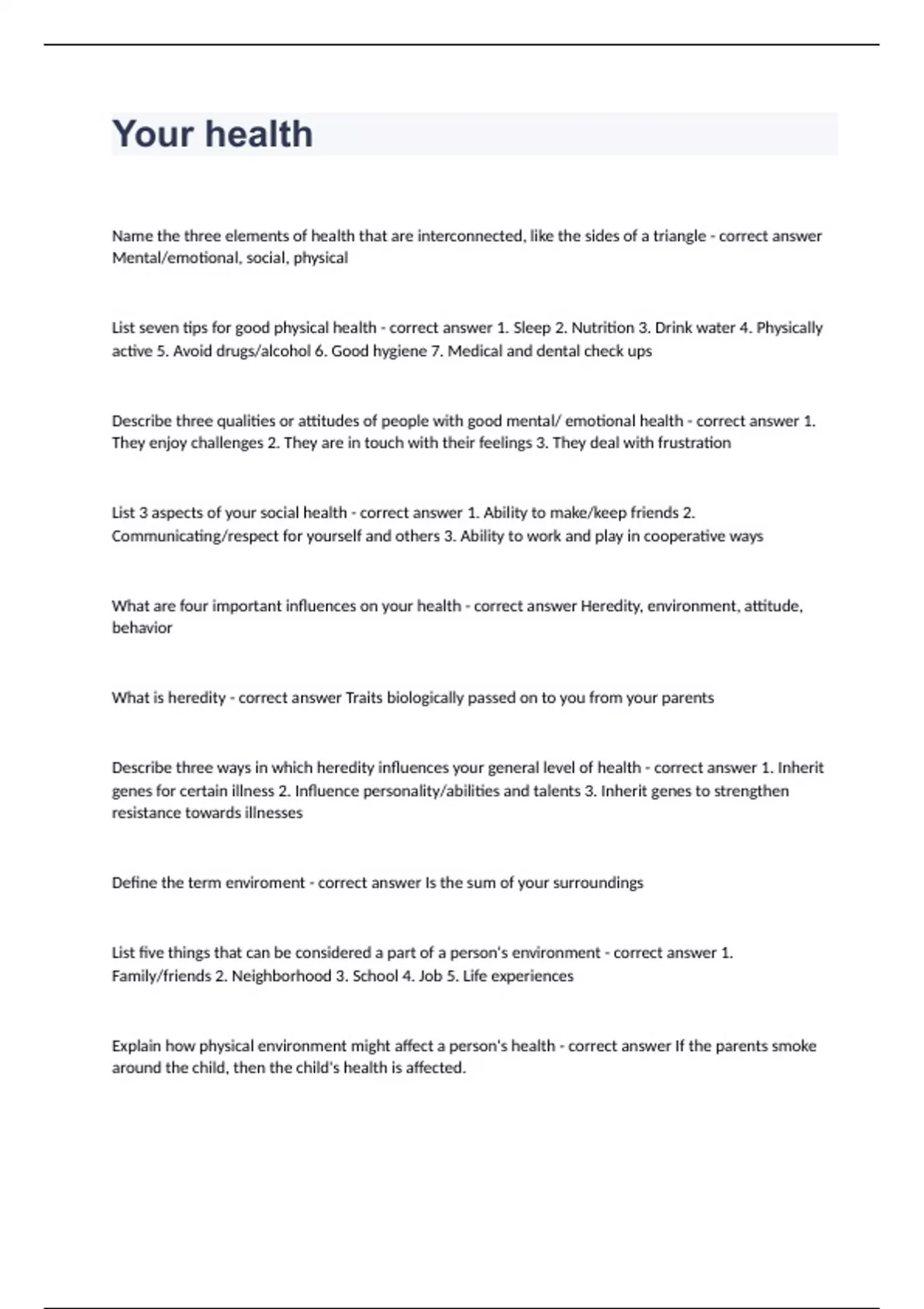 Your Health Practice Exam Questions 2024. Name the three elements of health that are interconnected, like the sides of a triangle - correct answer Mental/emotional, social, physical List seven tips for good physical health - correct answer 1. Sleep 2. Nutrition 3. Drink water 4. Physically active 5. Avoid drugs/alcohol 6. Good hygiene 7. Medical and dental check ups Describe three qualities or attitudes of people with good mental/ emotional health - correct answer 1. They enjoy challenges 2. They are in touch with their feelings 3. They deal with frustration List 3 aspects of your social health - correct answer 1. Ability to make/keep friends 2. Communicating/respect for yourself and others 3. Ability to work and play in cooperative ways What are four important influences on your health - correct answer Heredity, environment, attitude, behavior What is heredity - correct answer Traits biologically passed on to you from your parents Describe three ways in which heredity influences your general level of health - correct answer 1. Inherit genes for certain illness 2. Influence personality/abilities and talents 3. Inherit genes to strengthen resistance towards illnesses Define the term enviroment - correct answer Is the sum of your surroundings
