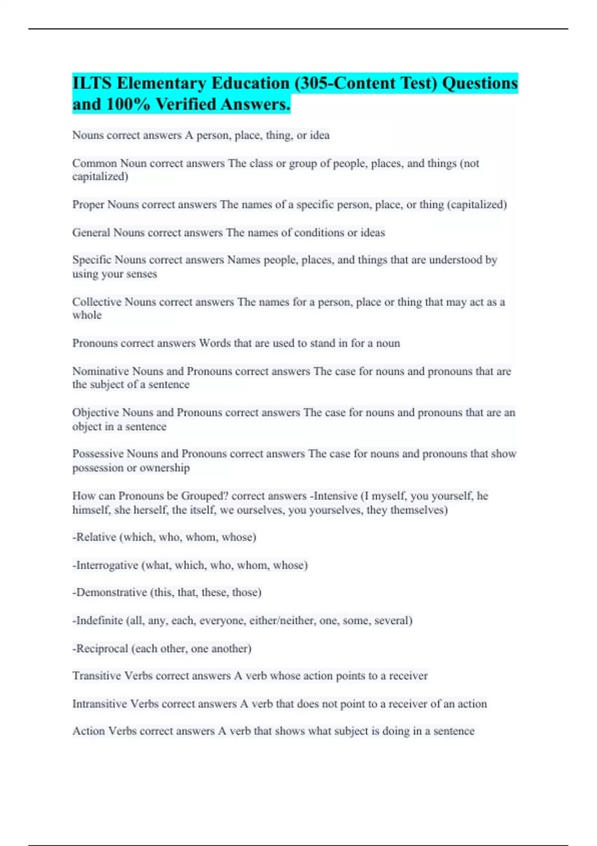 Nouns correct answers A person, place, thing, or idea Common Noun correct answers The class or group of people, places, and things (not capitalized) Proper Nouns correct answers The names of a specific person, place, or thing (capitalized) General Nouns correct answers The names of conditions or ideas Specific Nouns correct answers Names people, places, and things that are understood by using your senses Collective Nouns correct answers The names for a person, place or thing that may act as a whole Pronouns correct answers Words that are used to stand in for a noun Nominative Nouns and Pronouns correct answers The case for nouns and pronouns that are the subject of a sentence Objective Nouns and Pronouns correct answers The case for nouns and pronouns that are an object in a sentence Possessive Nouns and Pronouns correct answers The case for nouns and pronouns that show possession or ownership How can Pronouns be Grouped? correct answers -Intensive (I myself, you yourself, he himself, she herself, the itself, we ourselves, you yourselves, they themselves) -Relative (which, who, whom, whose) -Interrogative (what, which, who, whom, whose) -Demonstrative (this, that, these, those) -Indefinite (all, any, each, everyone, either/neither, one, some, several) -Reciprocal (each other, one another) Transitive Verbs correct answers A verb whose action points to a receiver Intransitive Verbs correct answers A verb that does not point to a receiver of an action Action Verbs correct answers A verb that shows what subject is doing in a sentence