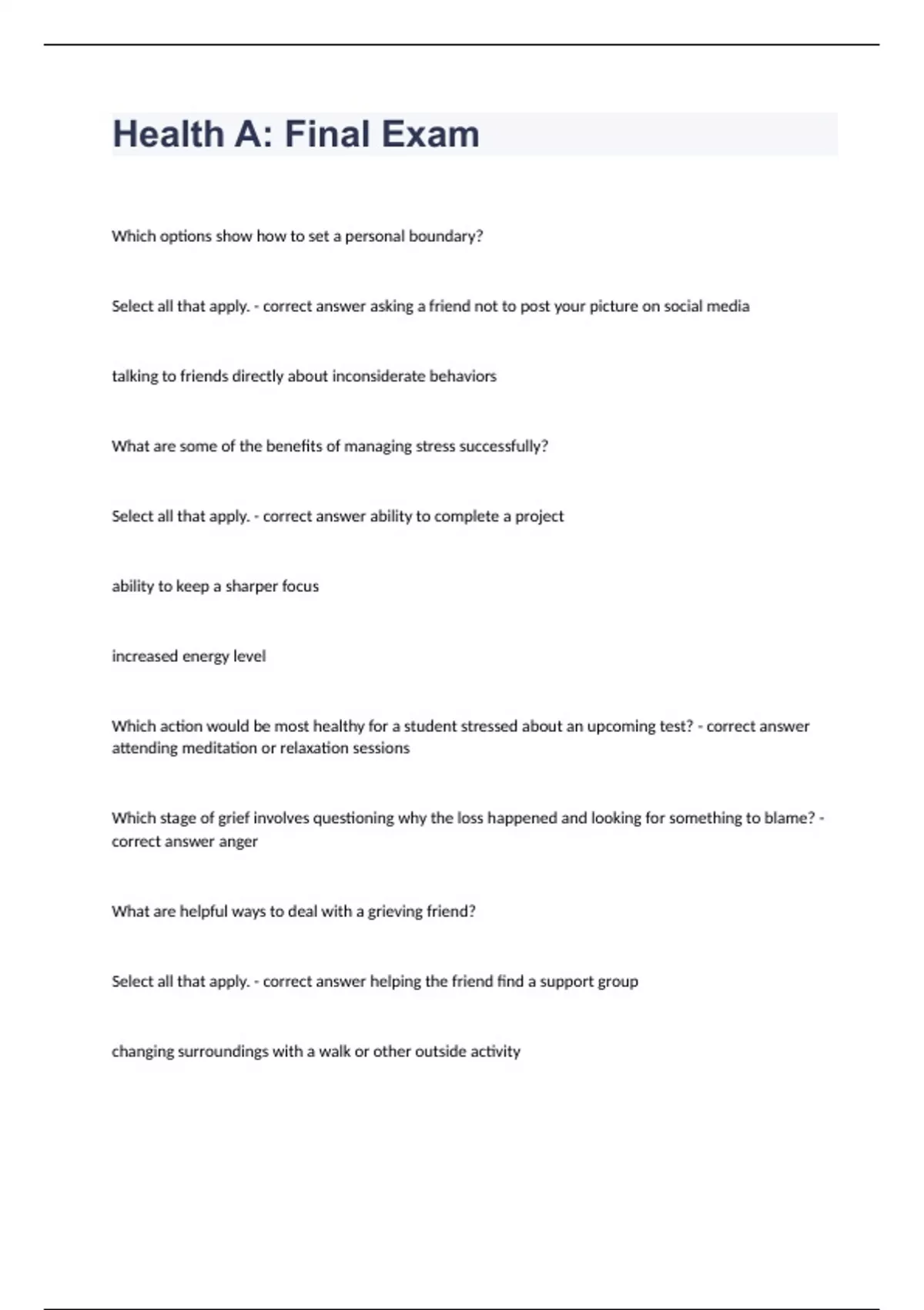 Health A Final Exam Review Test 2024. Which options show how to set a personal boundary? Select all that apply. - correct answer asking a friend not to post your picture on social media talking to friends directly about inconsiderate behaviors What are some of the benefits of managing stress successfully? Select all that apply. - correct answer ability to complete a project ability to keep a sharper focus increased energy level Which action would be most healthy for a student stressed about an upcoming test? - correct answer attending meditation or relaxation sessions Which stage of grief involves questioning why the loss happened and looking for something to blame? - correct answer anger What are helpful ways to deal with a grieving friend? Select all that apply. - correct answer helping the friend find a support group changing surroundings with a walk or other outside activity