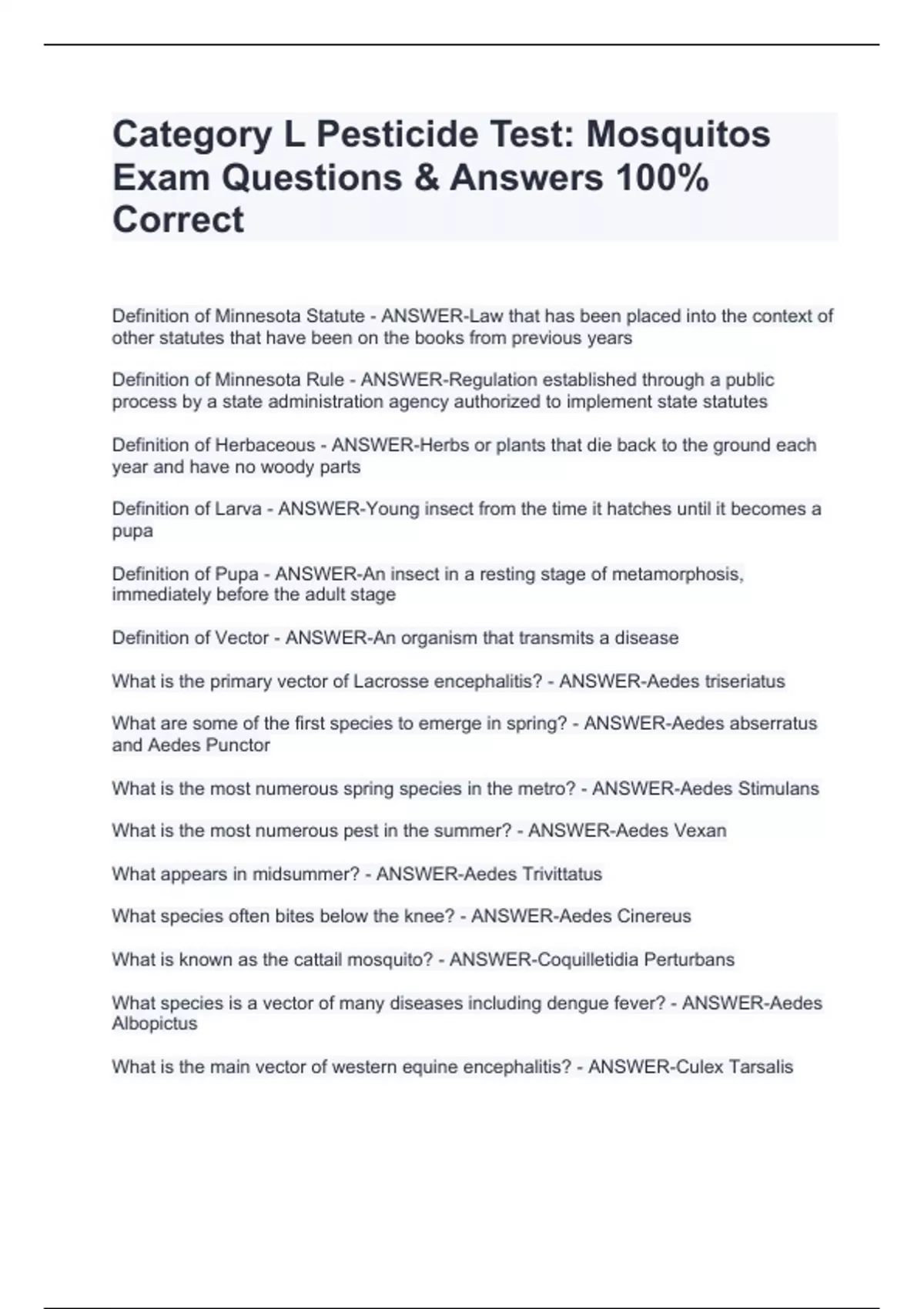 Category L Pesticide Test: Mosquitos Exam Questions & Answers 100% Correct Category L Pesticide Test: Mosquitos Exam Questions & Answers 100% Correct Category L Pesticide Test: Mosquitos Exam Questions & Answers 100% Correct Category L Pesticide Test: Mosquitos Exam Questions & Answers 100% Correct Definition of Minnesota Statute - ANSWER-Law that has been placed into the context of other statutes that have been on the books from previous years Definition of Minnesota Rule - ANSWER-Regulation established through a public process by a state administration agency authorized to implement state statutes Definition of Herbaceous - ANSWER-Herbs or plants that die back to the ground each year and have no woody parts