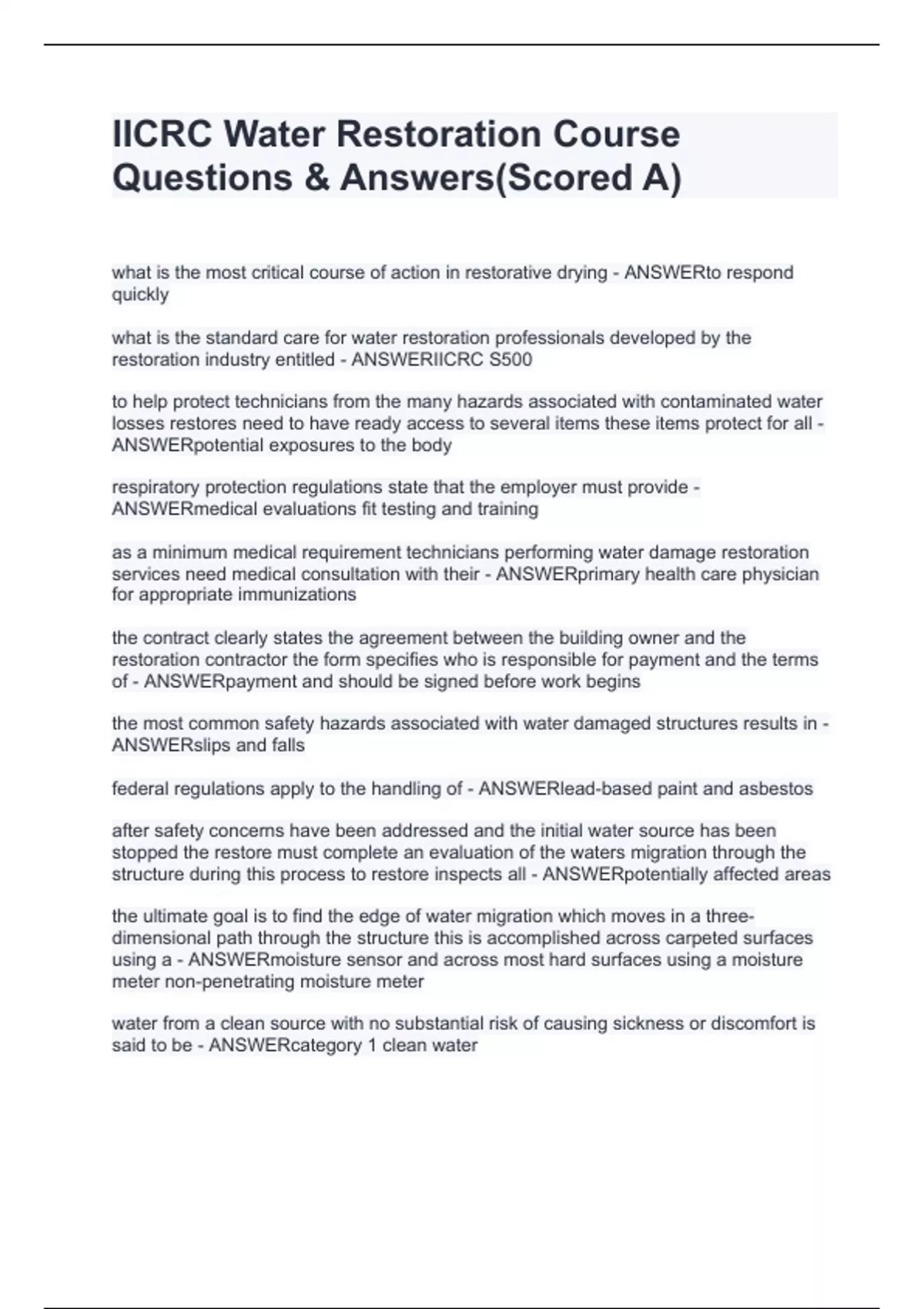 what is the most critical course of action in restorative drying - ANSWERto respond quickly what is the standard care for water restoration professionals developed by the restoration industry entitled - ANSWERIICRC S500 to help protect technicians from the many hazards associated with contaminated water losses restores need to have ready access to several items these items protect for all - ANSWERpotential exposures to the body respiratory protection regulations state that the employer must provide - ANSWERmedical evaluations fit testing and training as a minimum medical requirement technicians performing water damage restoration services need medical consultation with their - ANSWERprimary health care physician for appropriate immunizations the contract clearly states the agreement between the building owner and the restoration contractor the form specifies who is responsible for payment and the terms of - ANSWERpayment and should be signed before work begins the most common safety hazards associated with water damaged structures results in - ANSWERslips and falls federal regulations apply to the handling of - ANSWERlead-based paint and asbestos after safety concerns have been addressed and the initial water source has been stopped the restore must complete an evaluation of the waters migration through the structure during this process to restore inspects all - ANSWERpotentially affected areas the ultimate goal is to find the edge of water migration which moves in a three-dimensional path through the structure this is accomplished across carpeted surfaces using a - ANSWERmoisture sensor and across most hard surfaces using a moisture meter non-penetrating moisture meter water from a clean source with no substantial risk of causing sickness or discomfort is said to be - ANSWERcategory 1 clean water what are the has a significant degree of chemical biological and or physical contamination is - ANSWERCategory 2 when water intrusion results from a grossly unsanitary Source or carries - ANSWERpathogenic disease causing agents it is said to be Category 3 worker and occupant health and safety are the first priority on every sewage loss areas