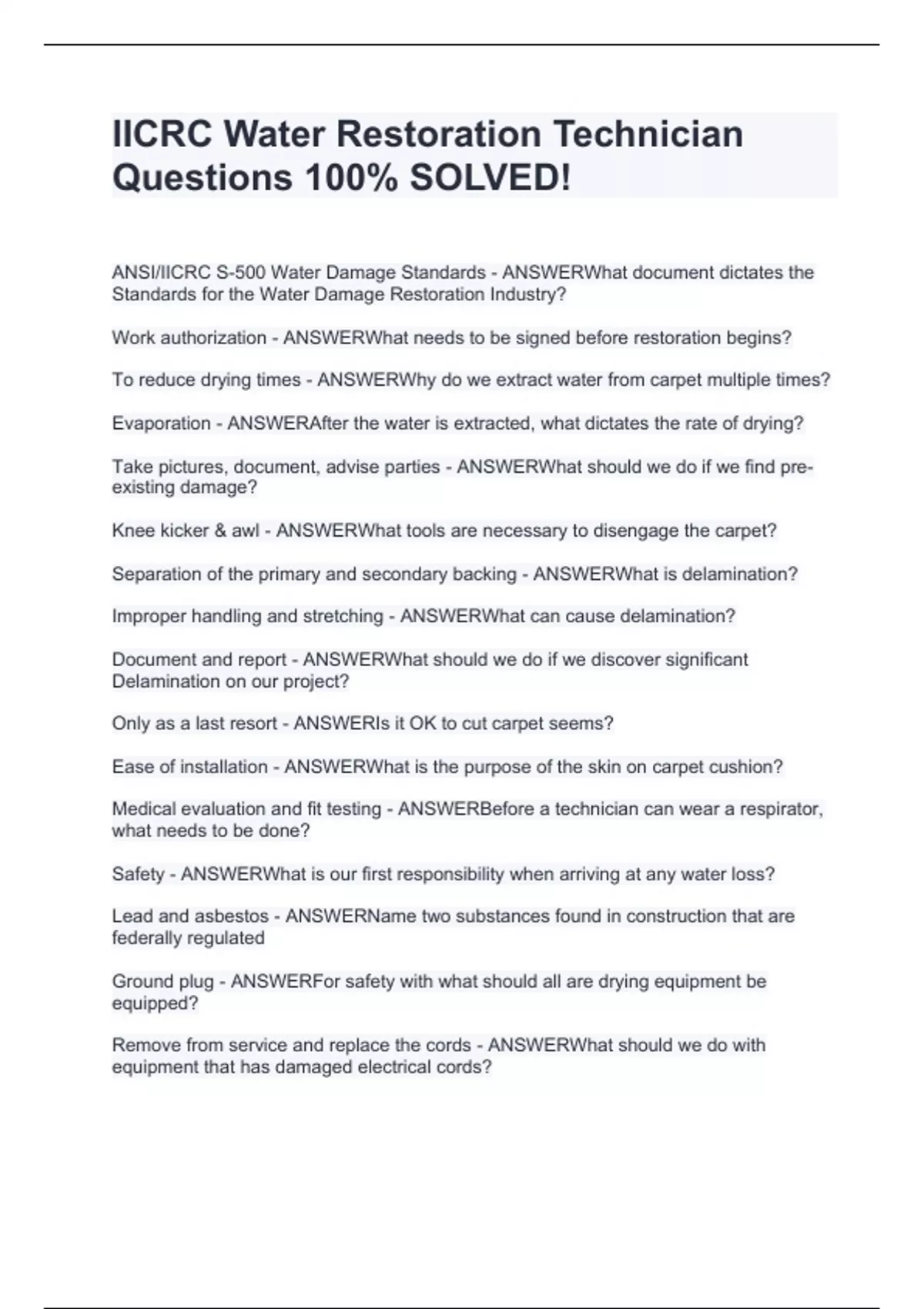 ANSI/IICRC S-500 Water Damage Standards - ANSWERWhat document dictates the Standards for the Water Damage Restoration Industry? Work authorization - ANSWERWhat needs to be signed before restoration begins? To reduce drying times - ANSWERWhy do we extract water from carpet multiple times? Evaporation - ANSWERAfter the water is extracted, what dictates the rate of drying? Take pictures, document, advise parties - ANSWERWhat should we do if we find pre-existing damage? Knee kicker & awl - ANSWERWhat tools are necessary to disengage the carpet? Separation of the primary and secondary backing - ANSWERWhat is delamination? Improper handling and stretching - ANSWERWhat can cause delamination? Document and report - ANSWERWhat should we do if we discover significant Delamination on our project? Only as a last resort - ANSWERIs it OK to cut carpet seems? Ease of installation - ANSWERWhat is the purpose of the skin on carpet cushion? Medical evaluation and fit testing - ANSWERBefore a technician can wear a respirator, what needs to be done? Safety - ANSWERWhat is our first responsibility when arriving at any water loss? Lead and asbestos - ANSWERName two substances found in construction that are federally regulated Ground plug - ANSWERFor safety with what should all are drying equipment be equipped? Remove from service and replace the cords - ANSWERWhat should we do with equipment that has damaged electrical cords?